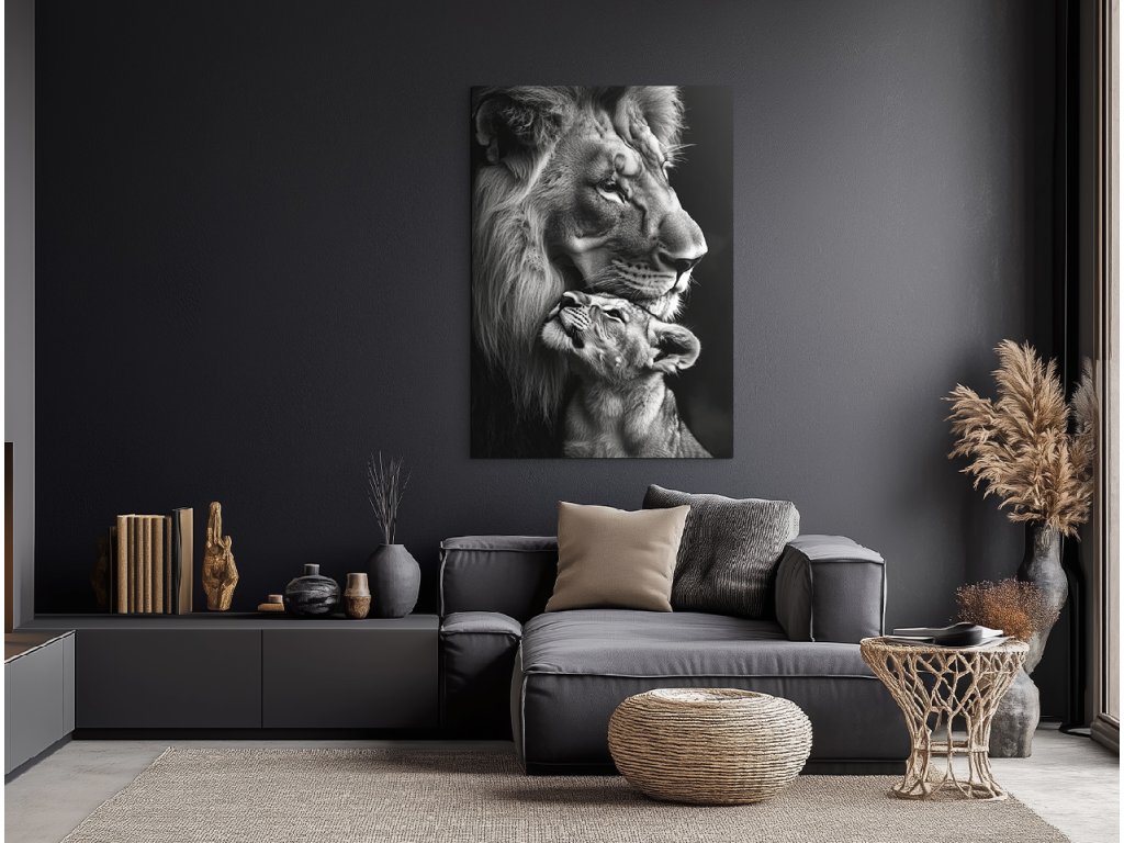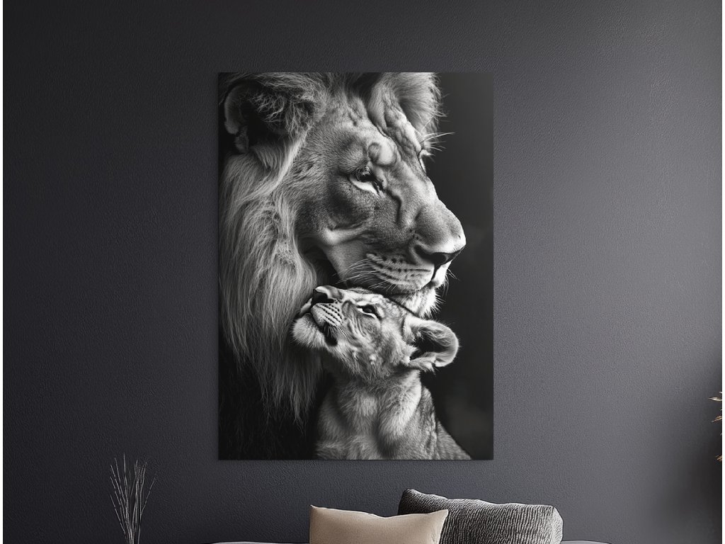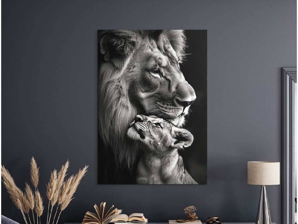 Pod ochranou lva je černobílý portrét zachycující silné pouto mezi lvem a lvíčetem. Majestátní lev hledí přímo před sebe, klidně a ostražitě, zatímco mládě vzhlíží k němu s důvěrou a obdivem. Detaily srsti, očí a výrazu vynikají v kontrastu světla a stínu, čímž obraz působí silně a zároveň intimně. Dílo vyzařuje respekt, bezpečí a hluboký vztah, který osloví každého milovníka přírody, rodiny a ticha v síle.