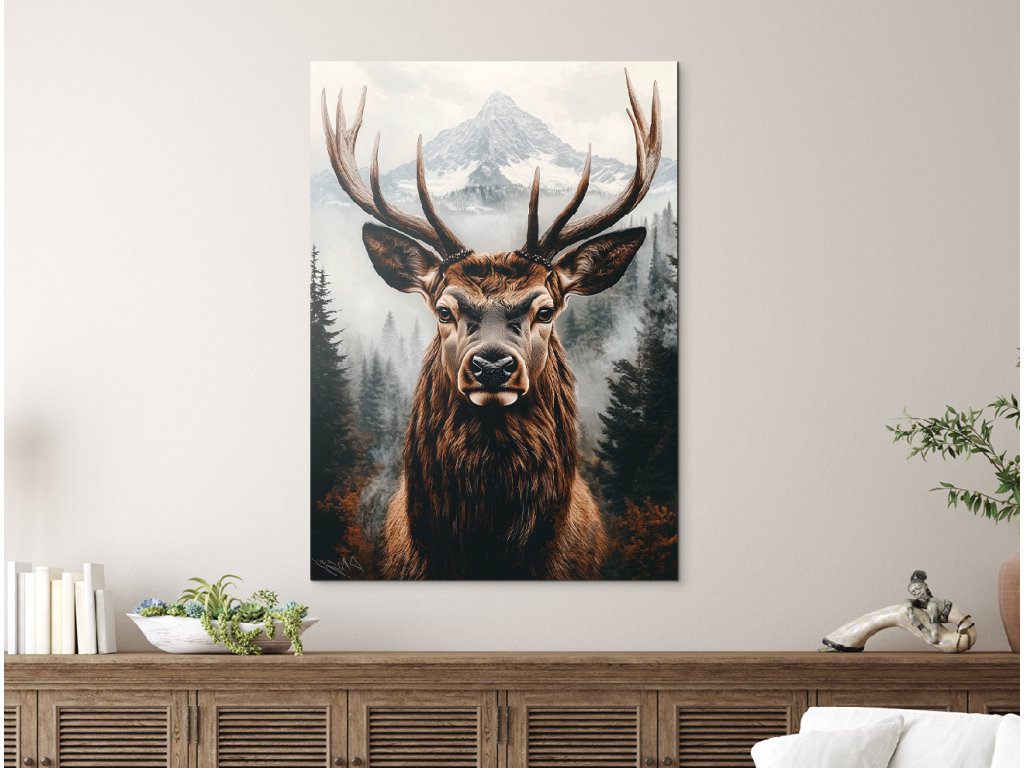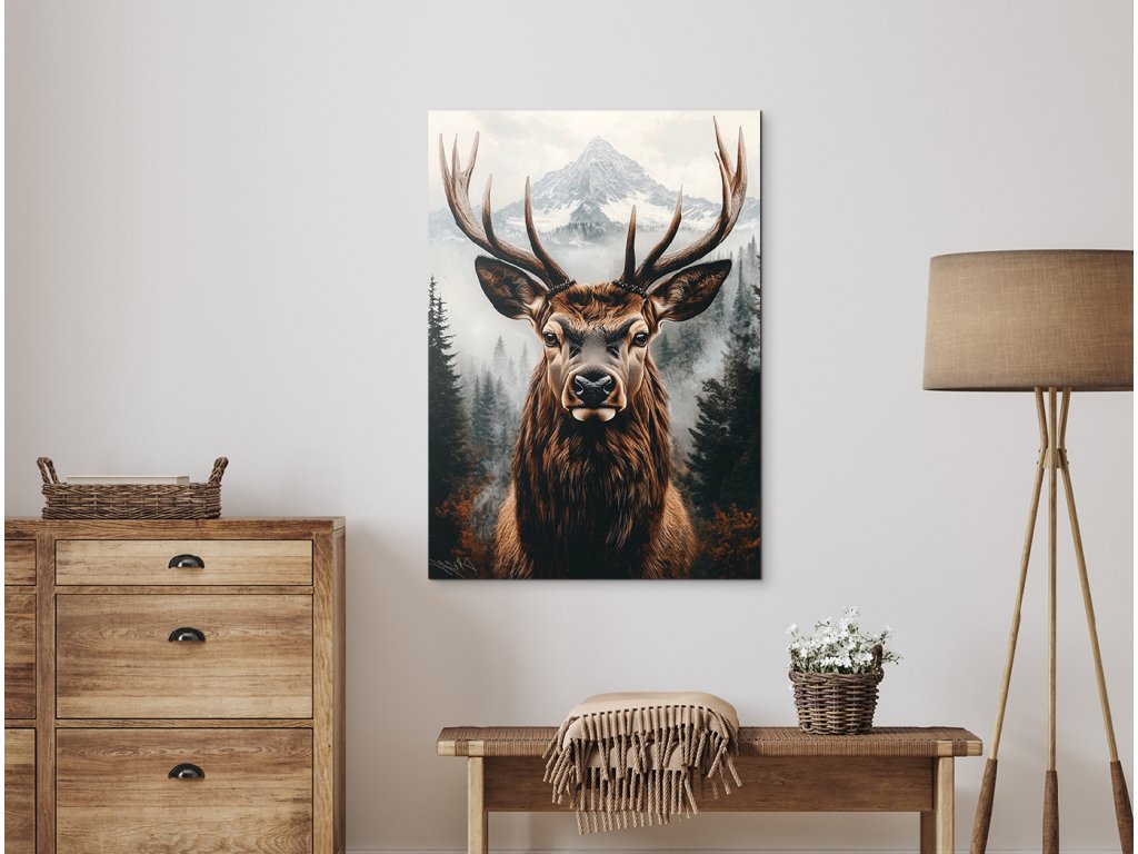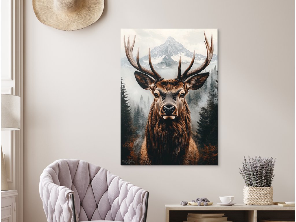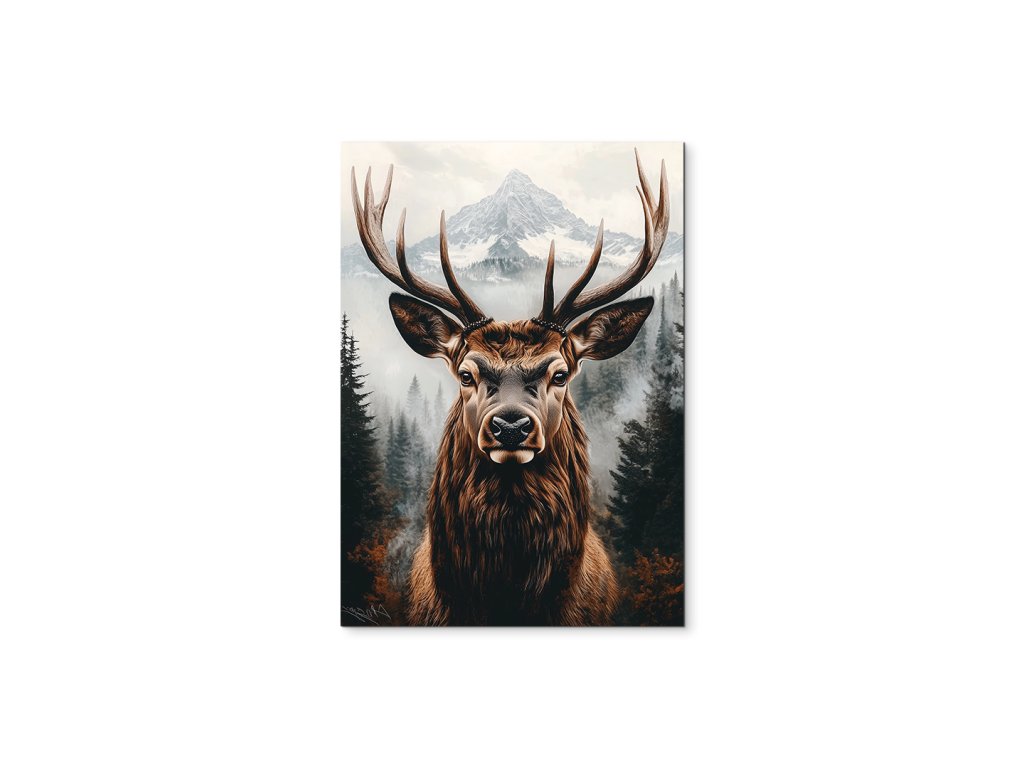 Vládce ticha je obraz s realistickým výtvarným zpracováním, který zachycuje mohutnou hlavu jelena v popředí, za kterou se zvedá majestátní hora a hustý les. Precizní štětcová technika dodává kompozici hloubku a důstojnost, čímž vzniká silný symbol síly, klidu a spojení s divokou přírodou. Ideální pro interiéry s rustikálním, přírodním nebo loveckým charakterem – výborně vynikne jako dominantní prvek v obýváku, pracovně nebo horské chatě.