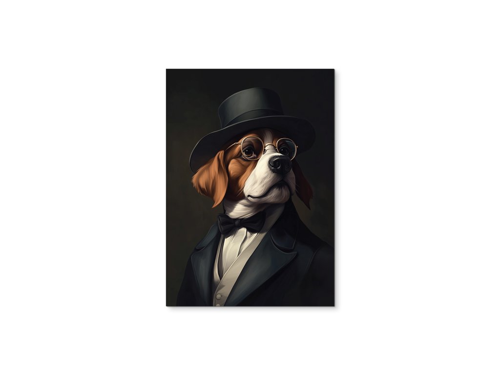 Čestný pan bígl je půvabný portrét plemene bígl ztvárněného jako viktoriánský gentleman s vytříbeným vkusem. V tmavém obleku, s černým motýlkem, cylindrem a kulatými brýlemi působí seriózně, ale zároveň s neodolatelně jemným výrazem typickým pro toto plemeno. Umělecké provedení dodává obrazu šmrnc klasického portrétu s nádechem humoru – ideální doplněk pro milovníky psů, stylu a jemné britské ironie.