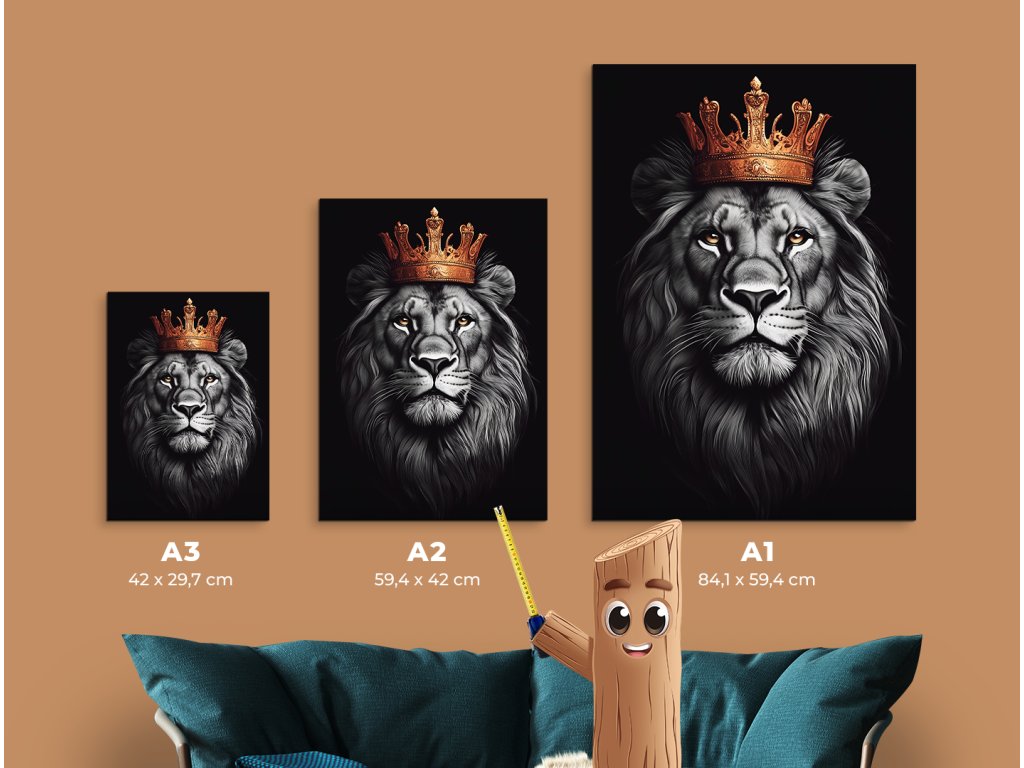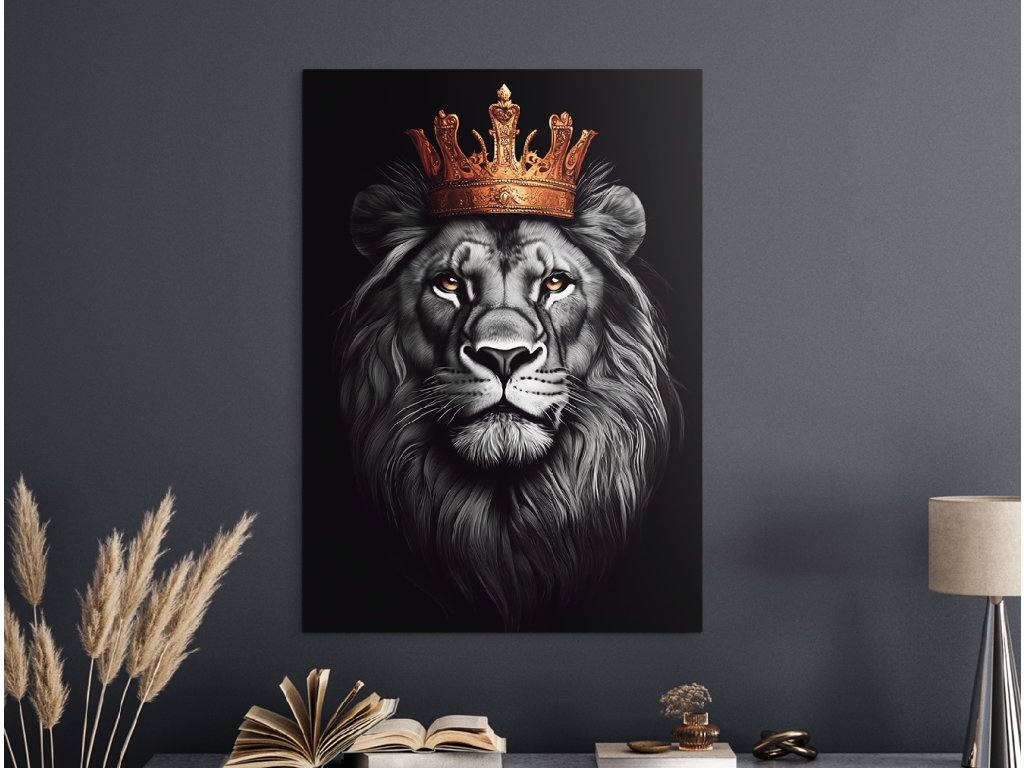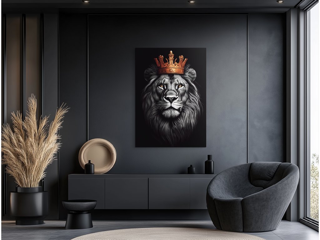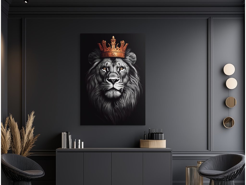 Korunovaný král je působivý portrét lva s majestátnou zlatou korunou, který ztělesňuje důstojnost, sílu a klid. Hrdý pohled lva, kontrast šedých a černých odstínů jeho hřívy se zářivou zlatou korunou, vytváří dramatický a zároveň elegantní vizuál. Tmavé pozadí umocňuje intenzitu výrazu a činí z obrazu výjimečný centrální prvek v každém prostoru. Ideální pro interiér, který hledá rovnováhu mezi silou a noblesou.