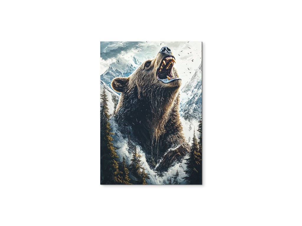 Medvěd severu je výjimečný obraz zachycující medvěda v plné síle uprostřed divoké zimní krajiny. Stojí v obklopení vysokých jehličnatých stromů, s hlavou zvednutou k nebi a otevřenou tlamou – jakoby jeho řev rezonoval napříč horami. V pozadí se rýsují majestátní, zasněžené vrcholky a dramatická obloha s mraky podtrhuje atmosféru nespoutaného přírodního světa. Tento výjev ztělesňuje sílu, respekt a čistou divočinu.