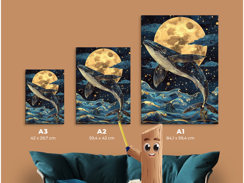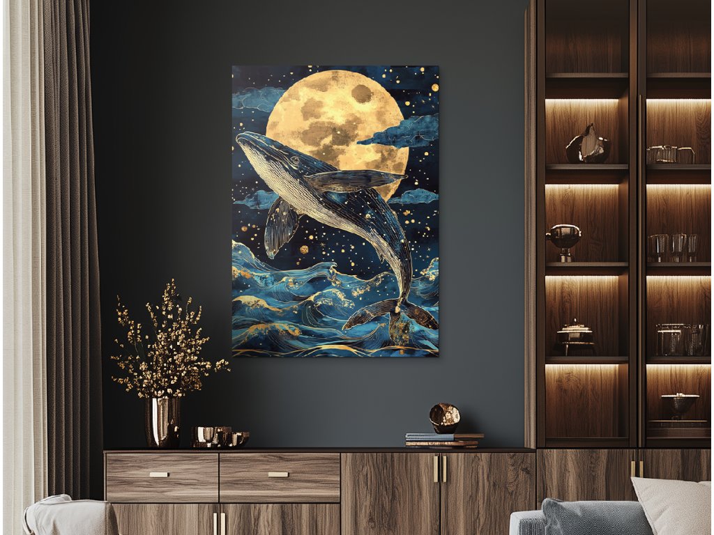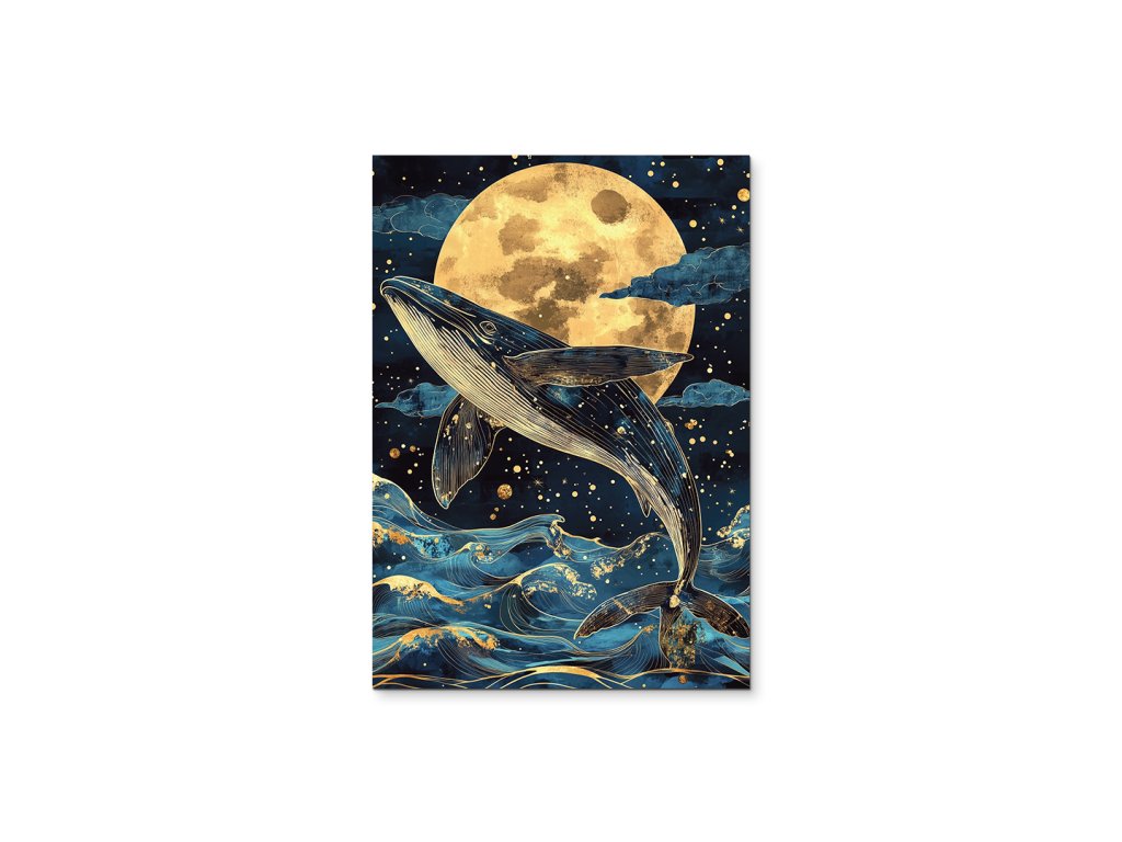 Měsíční zpěv velryby zachycuje plejtváka ozrutného v okamžiku, kdy se vynořuje z temnoty oceánu do jemné záře měsíce. Zlatavé odlesky měsíčního svitu se lámou na tmavomodrých vlnách, zatímco tiché pnutí vody a světla vytváří téměř snovou atmosféru. Zpomalený moment, kdy se obrovské tělo dotýká světla, působí nadpozemsky - jako starodávný rituál mezi nebem a hlubinou. Obraz je silný, poetický a vyzařuje úctu k přírodě a tichu noci.