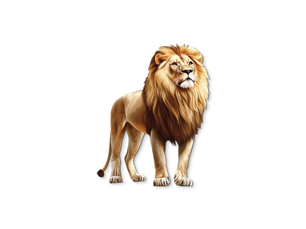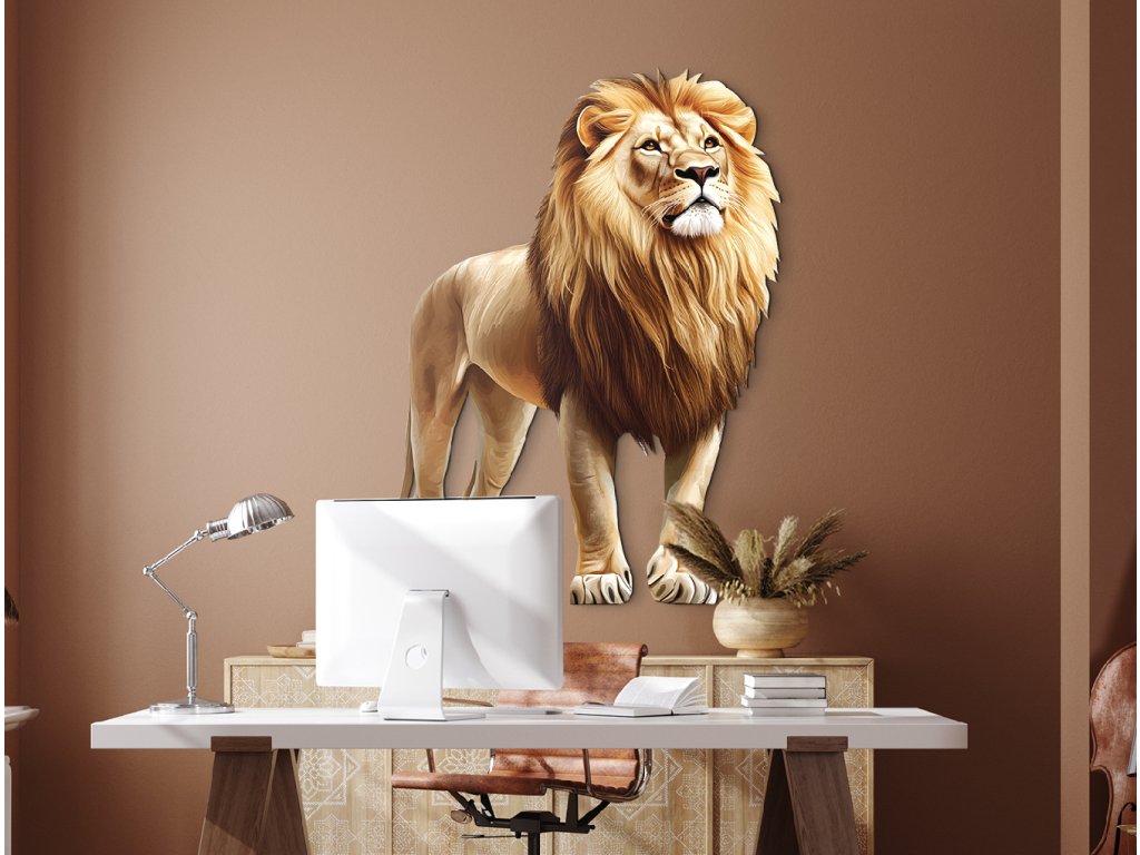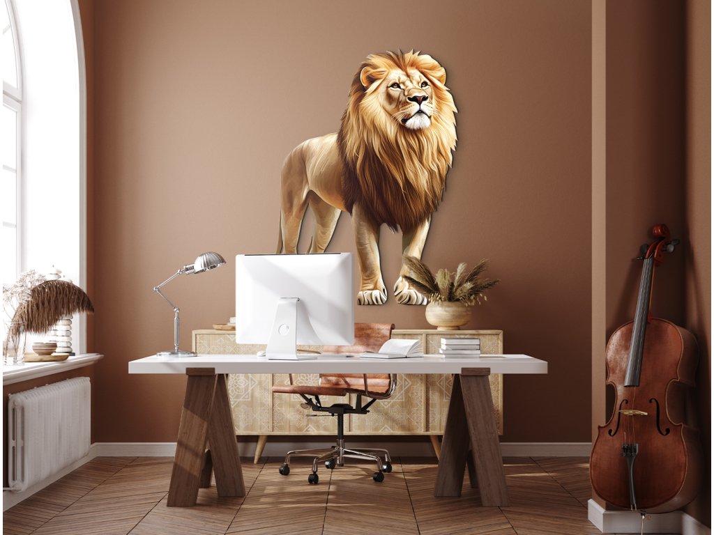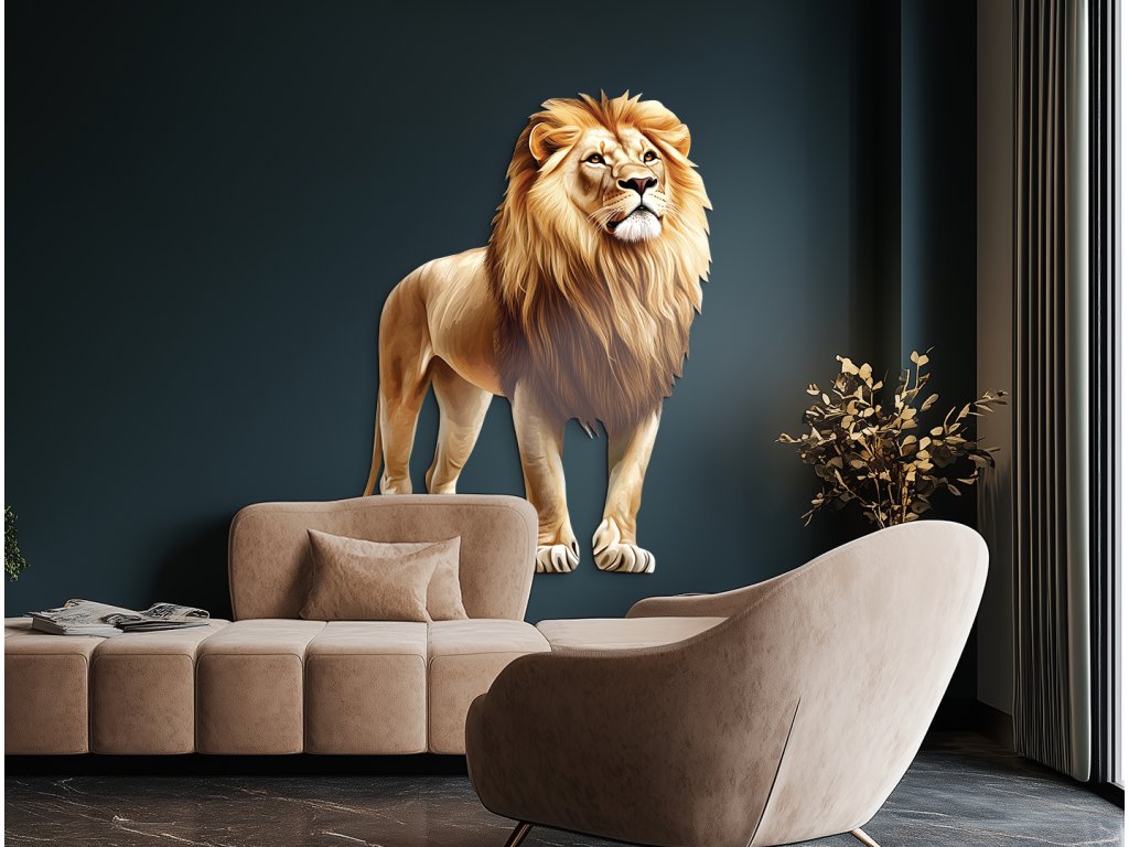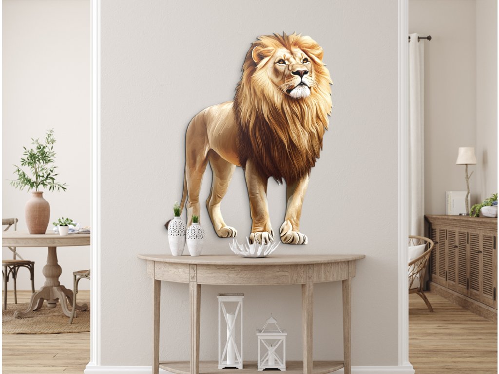 Obraz zobrazuje lva stojícího vzpřímeně a klidně, s hlavou mírně zvednutou a hlubokým pohledem upřeným v dálku. Jeho postoj vyzařuje důstojnost, sebevědomí a tichou sílu, která nepotřebuje řev. Ve spojení s neutrálním nebo přírodním pozadím bude působit jako symbol moudrosti, odvahy a vůdcovství – jako pravý král přírody.