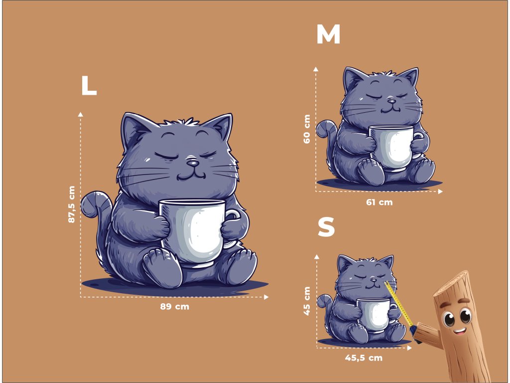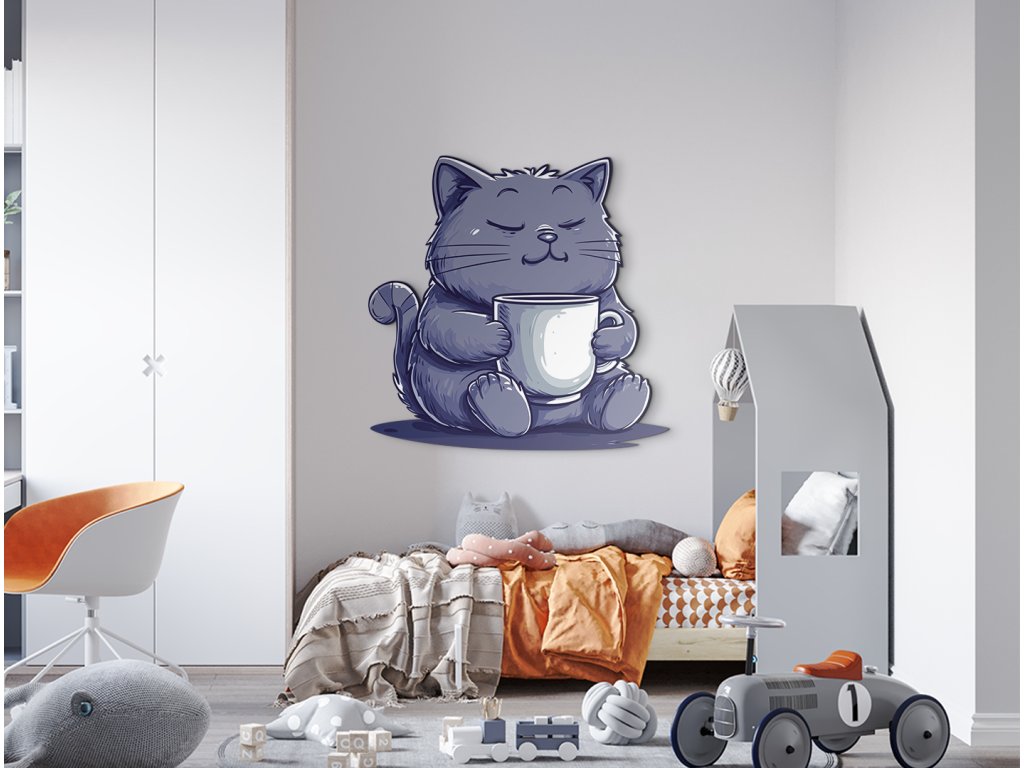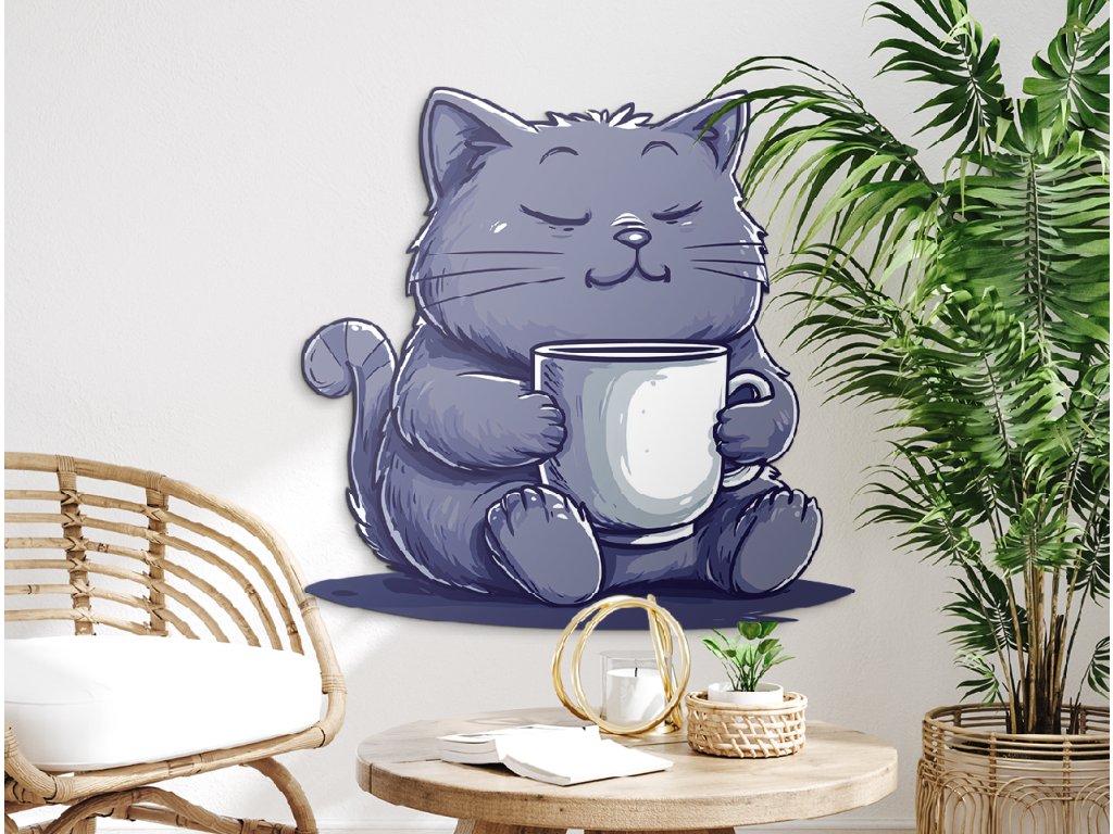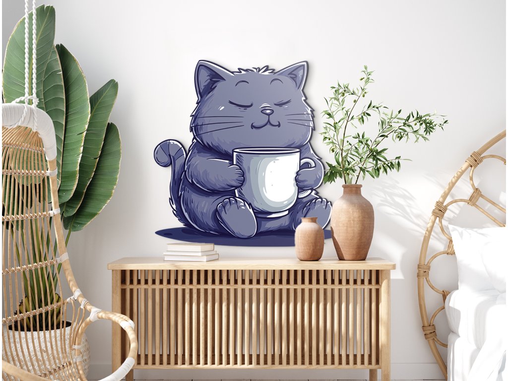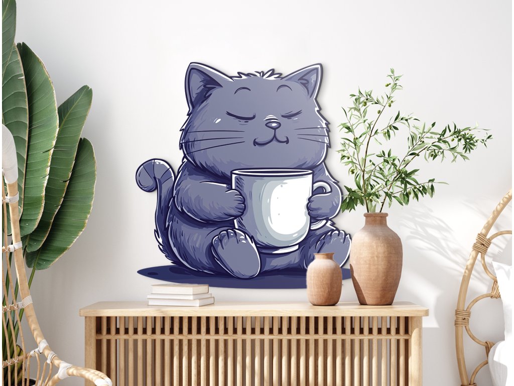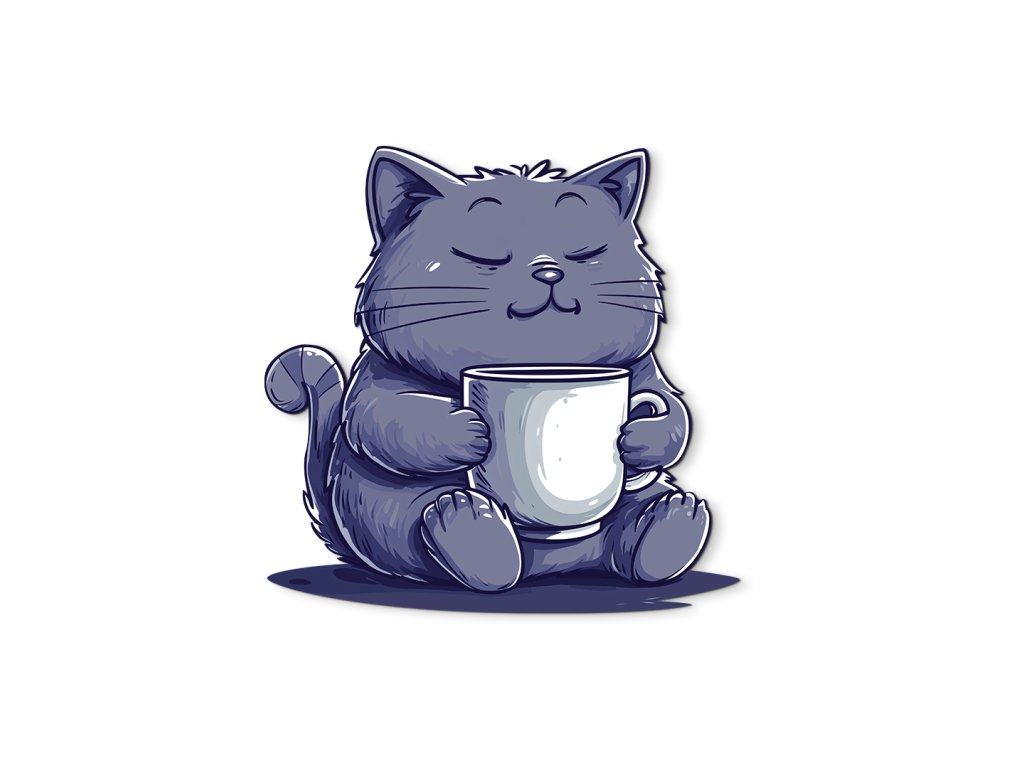 Roztomilá kreslená kočka s modře šedou srstí klidně sedí a objímá bílý hrnek, jako by si vychutnávala teplý nápoj. Se zavřenýma očima a mírným úsměvem působí naprosto spokojeně – jako dokonalý symbol odpočinku a pohody.