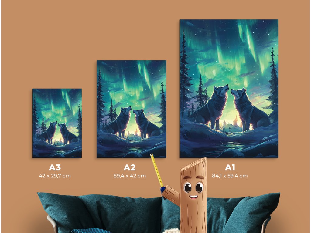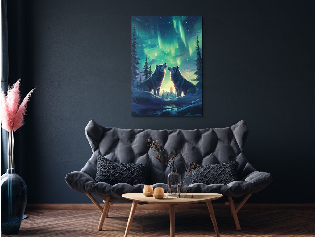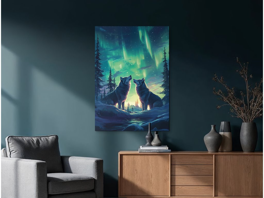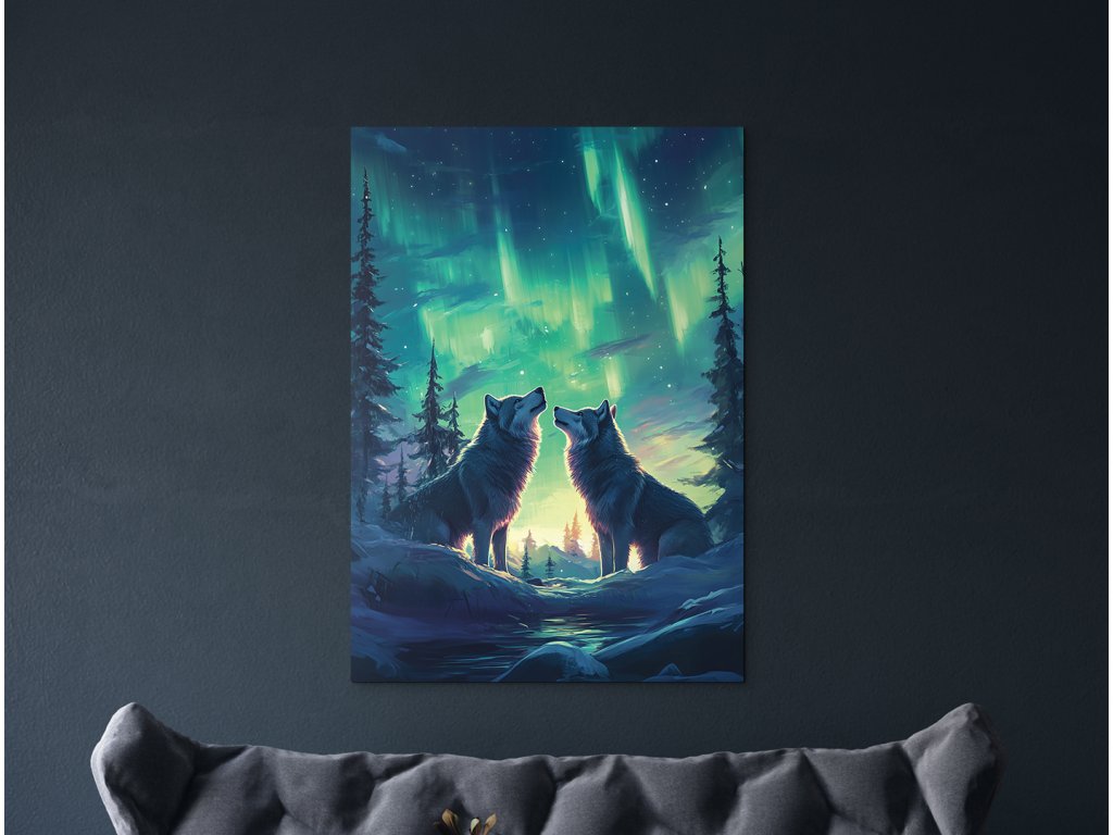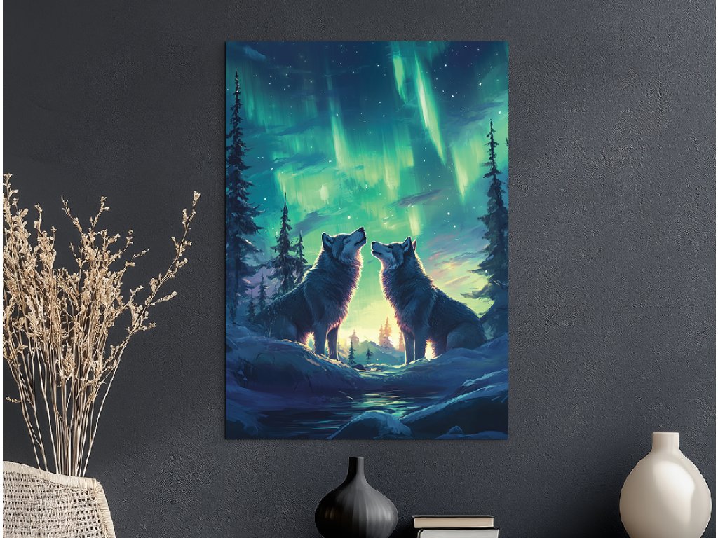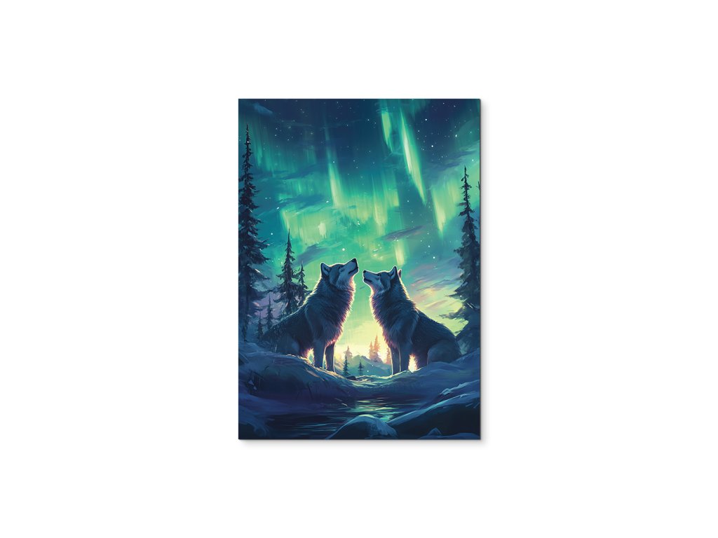 Polární duet vlků je kouzelná zimní scéna zachycující dvojici vlků, kteří společně vyjí pod tancem polární záře. Jejich postavy se vyjímají v bílé krajině mezi zasněženými borovicemi, zatímco nad nimi září zelenomodrá obloha plná pohybu a světla. Obraz ztělesňuje spojení přírody, divoké komunikace a tiché krásy severu.