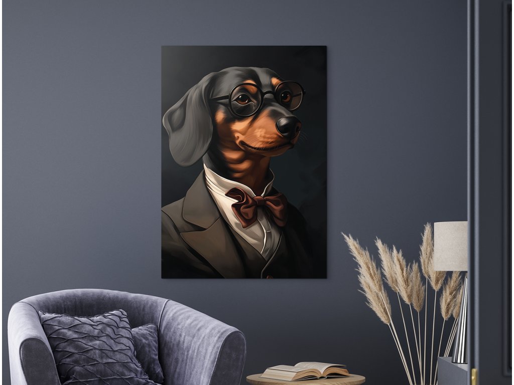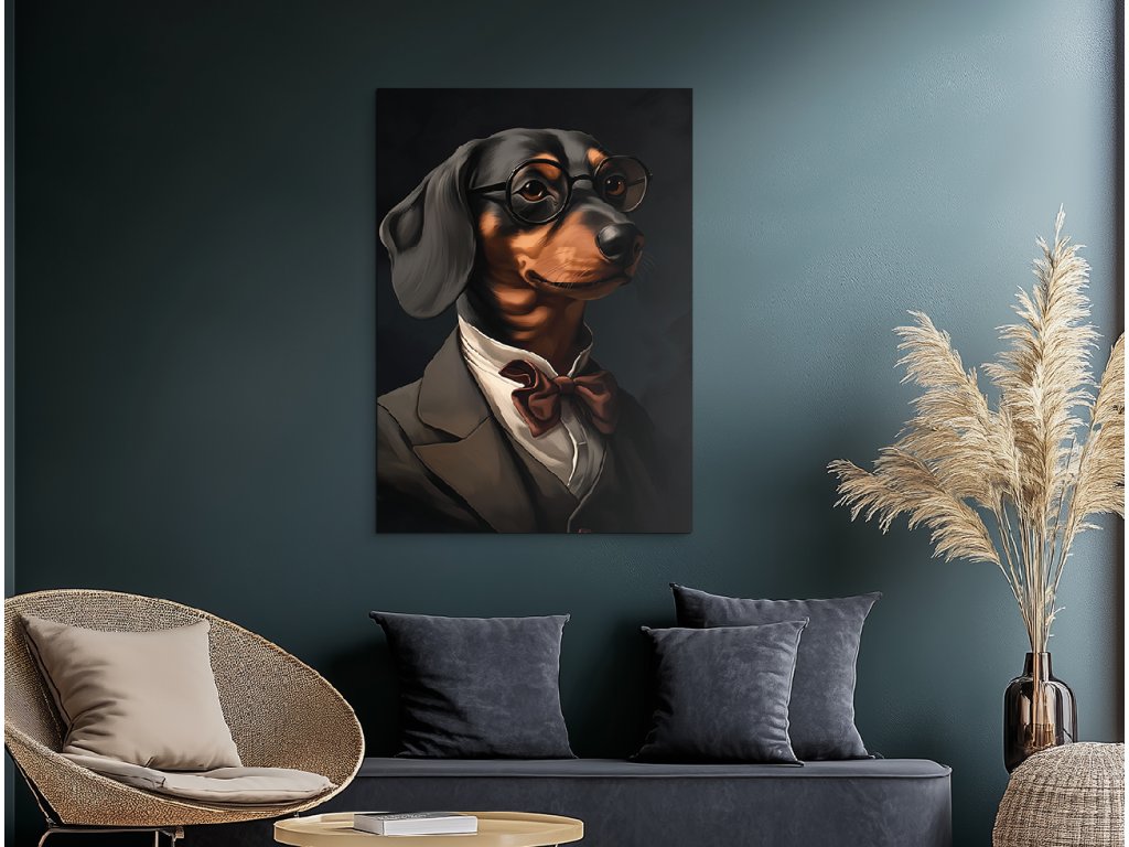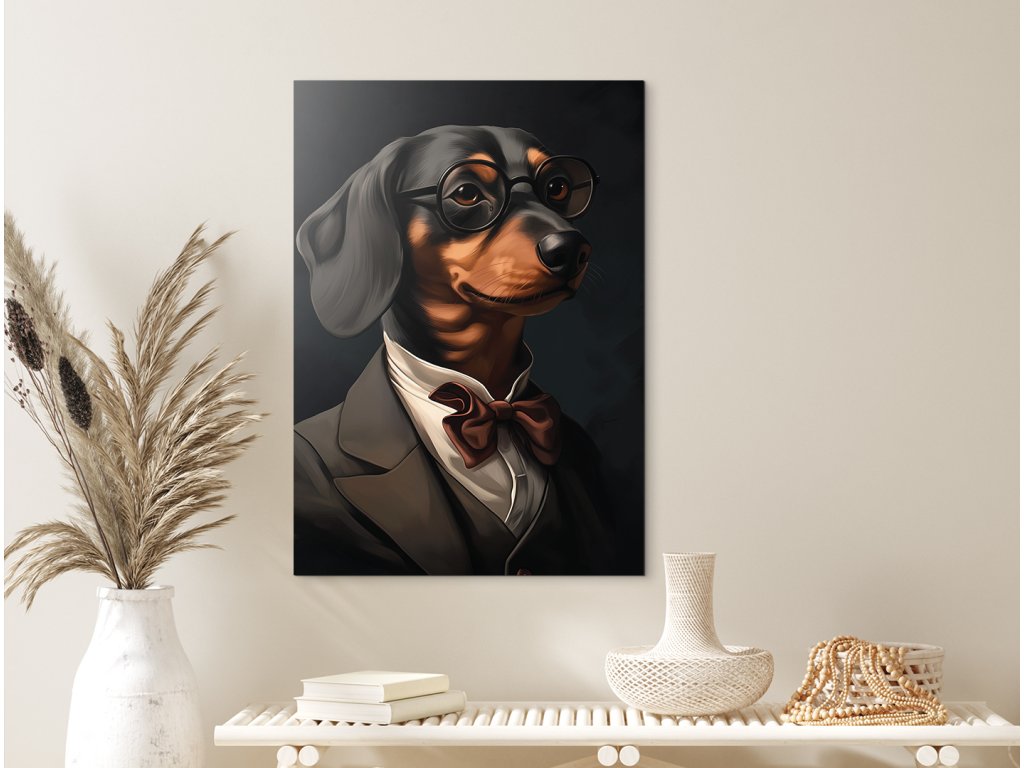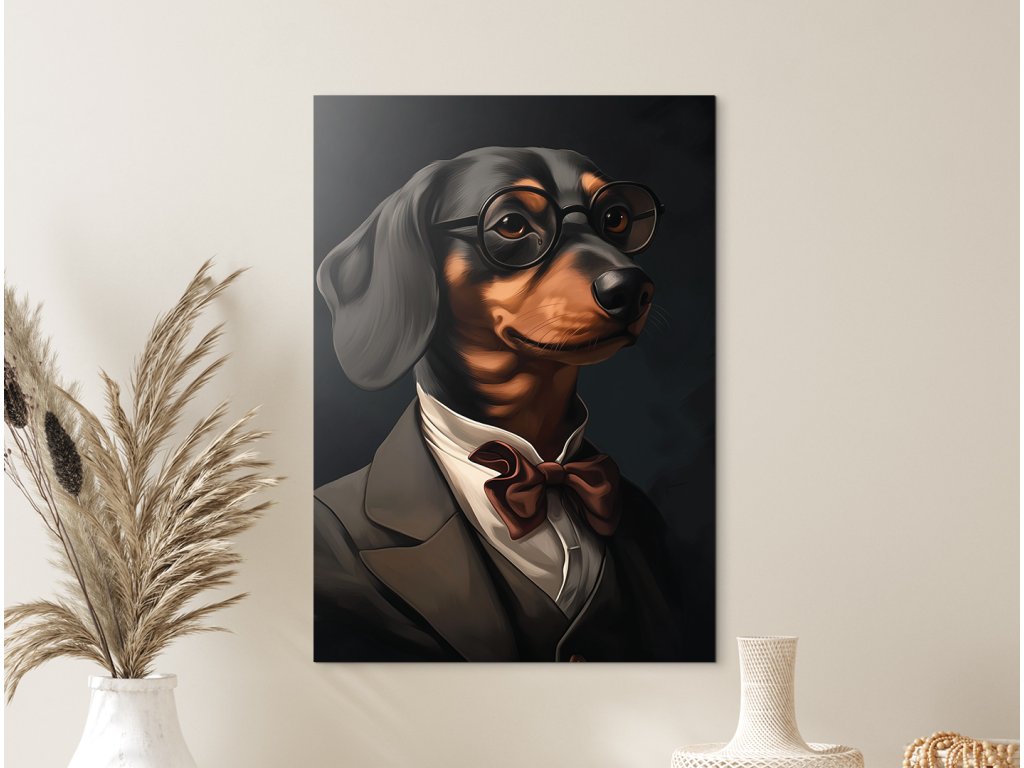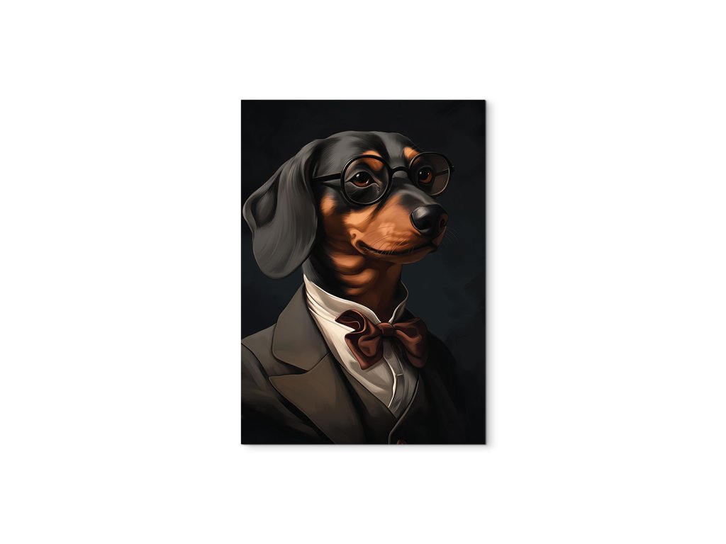 Profesor jezevčík je vkusně humorný a zároveň elegantní portrét psa plemene dachshund, který působí jako starý univerzitní profesor s názorem. Oblečený v tmavém obleku s bílou košilí a bordó motýlkem, s kulatými brýlemi na nose, vyzařuje moudrost, klid a špetku excentričnosti. Realistické provedení srsti a výrazu v kontrastu s tmavým pozadím činí z tohoto obrazu ideální doplněk pro interiér se stylem – ať už v knihovně, pracovně nebo prostorách s humorem a šarmem.