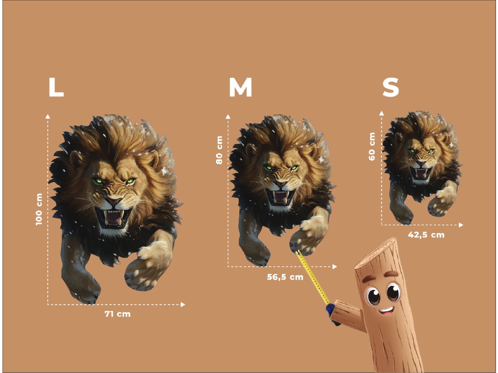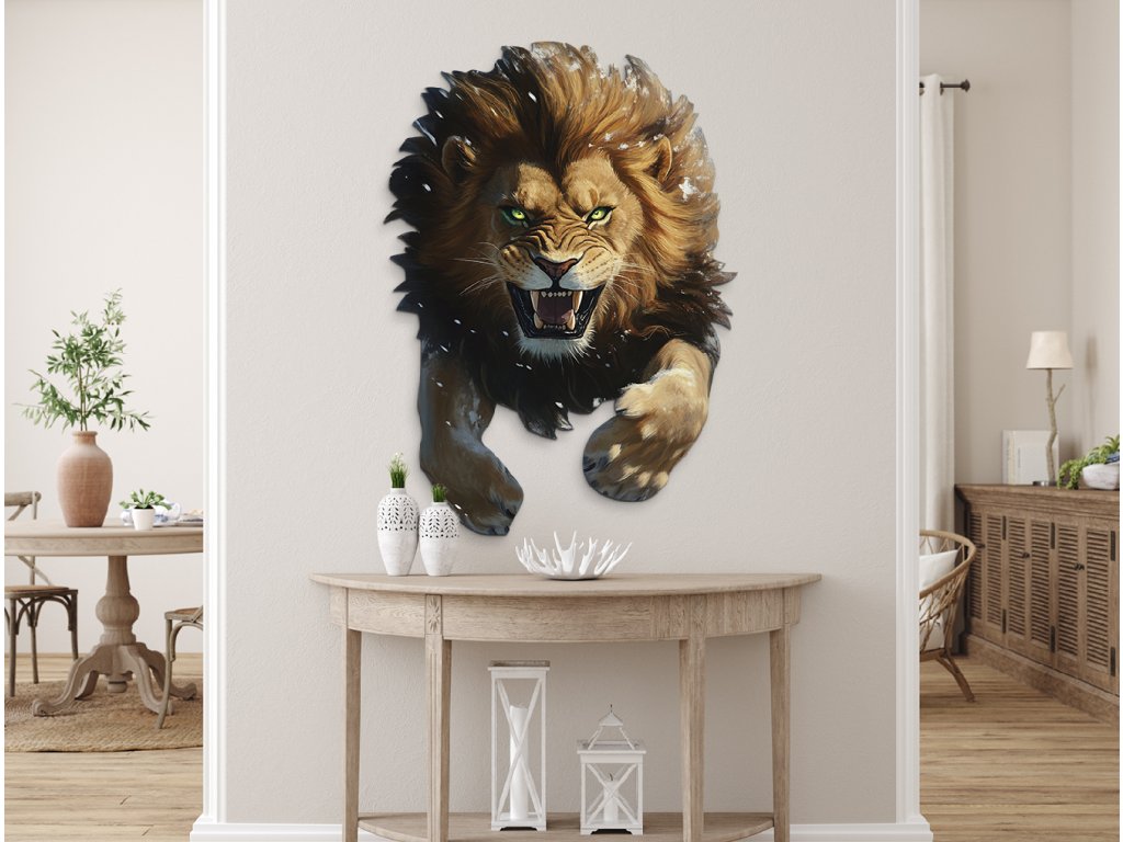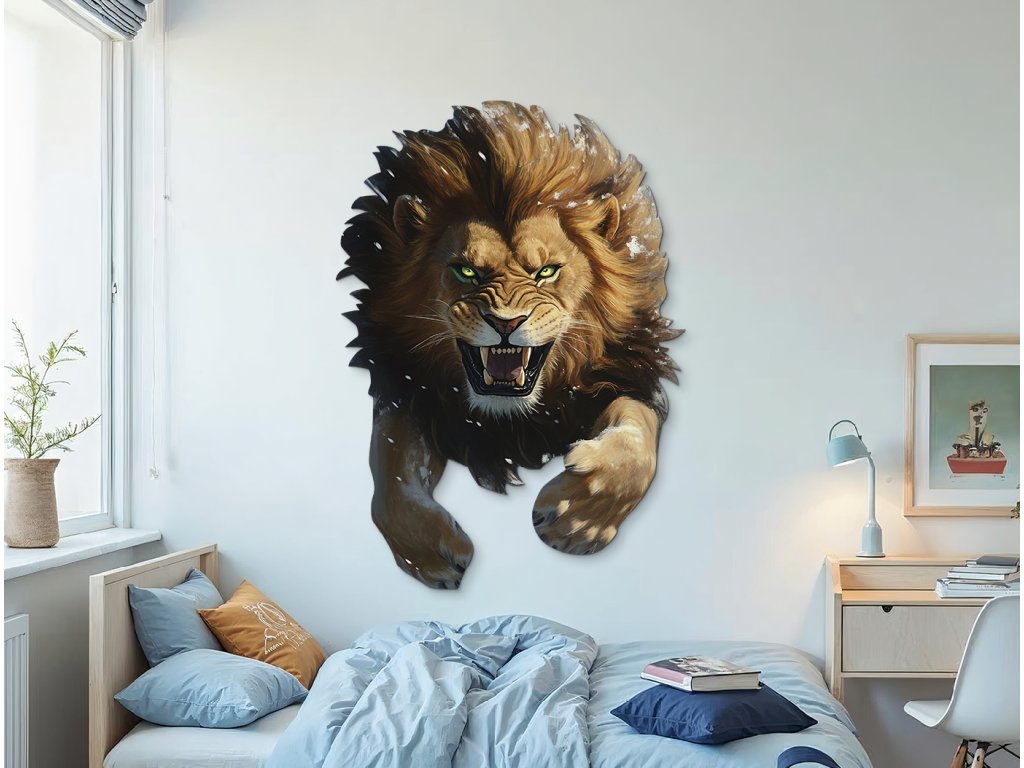 Nápaditá nálepka na zeď zachycuje řvoucího lva s rozcuchanou hřívou a pronikavýma zelenýma očima. Trojrozměrný efekt dodává výjevu dynamiku a sílu, zatímco otevřená tlama se zuby zdůrazňuje dravost a odhodlání. Výrazný prvek do interiéru s energií divočiny.