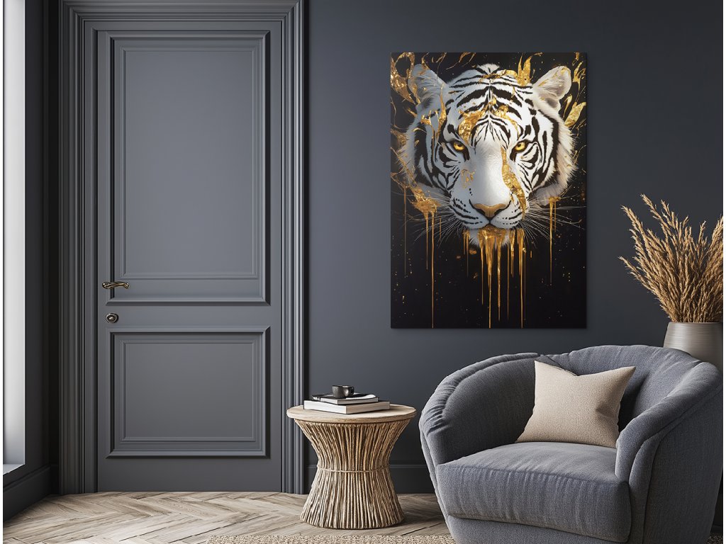 Očima bílého tygra je výjimečný obraz, který spojuje divokost a noblesu v jediné siluetě – hlavě bílého tygra. Jeho žluté oči září do tmy s pronikavou silou, zatímco zlaté akcenty působí jako tekutý kov stékající po jeho srsti a rozlévající se do černého pozadí. Kontrast bílé srsti, černých pruhů a metalických detailů vytváří dojem luxusu, moci a nehybných emocí v pohybu. Obraz je ideálním centrem pozornosti pro interiér, který hledá výjimečný vizuální moment.