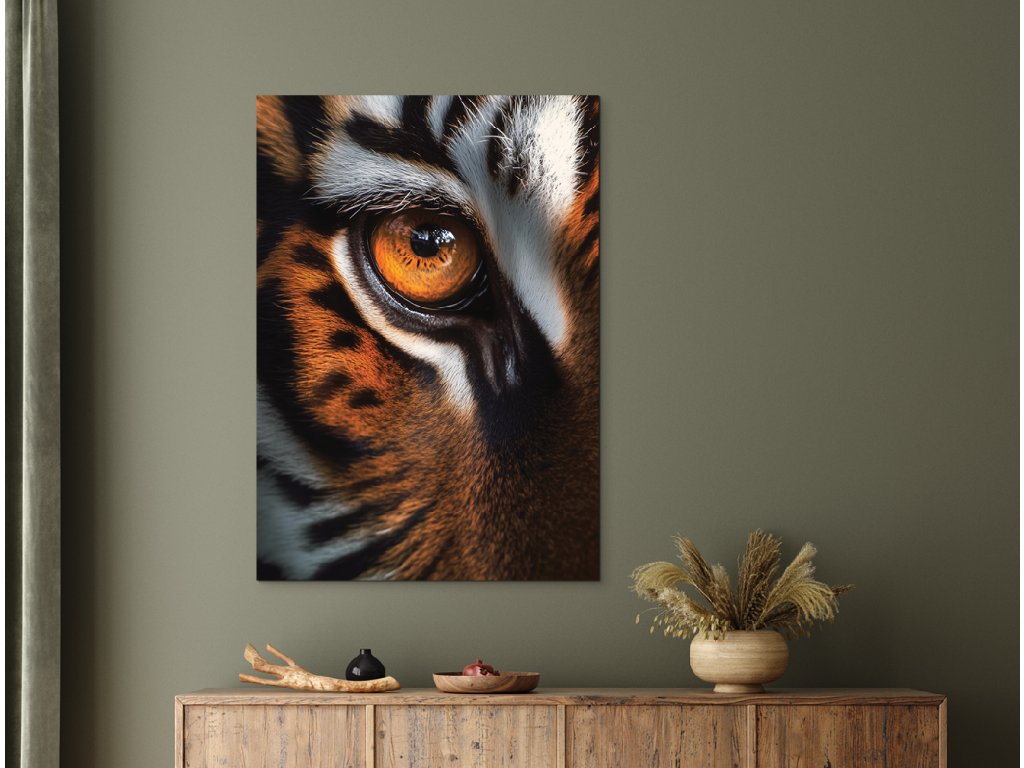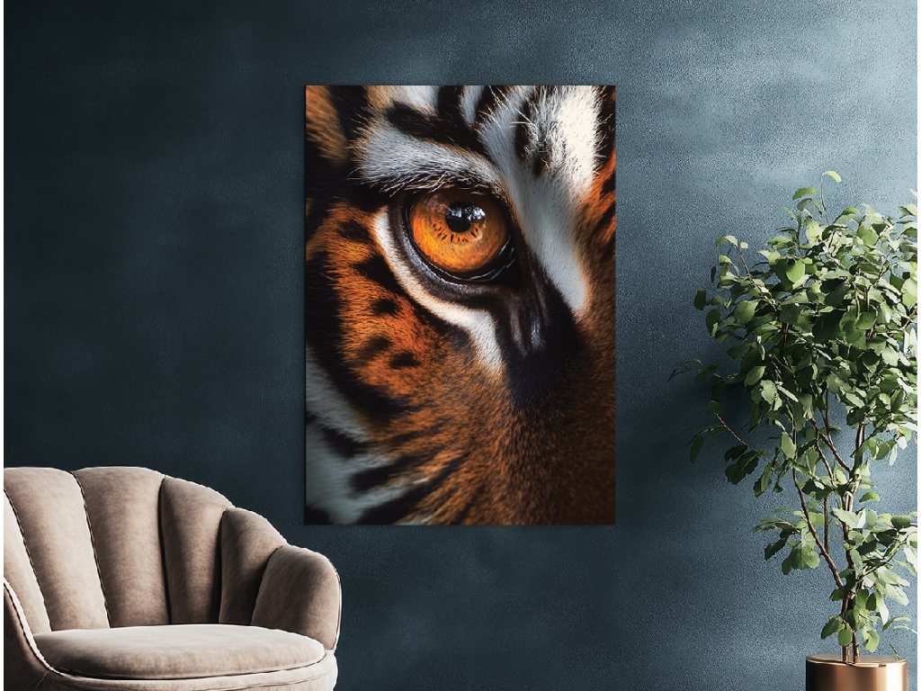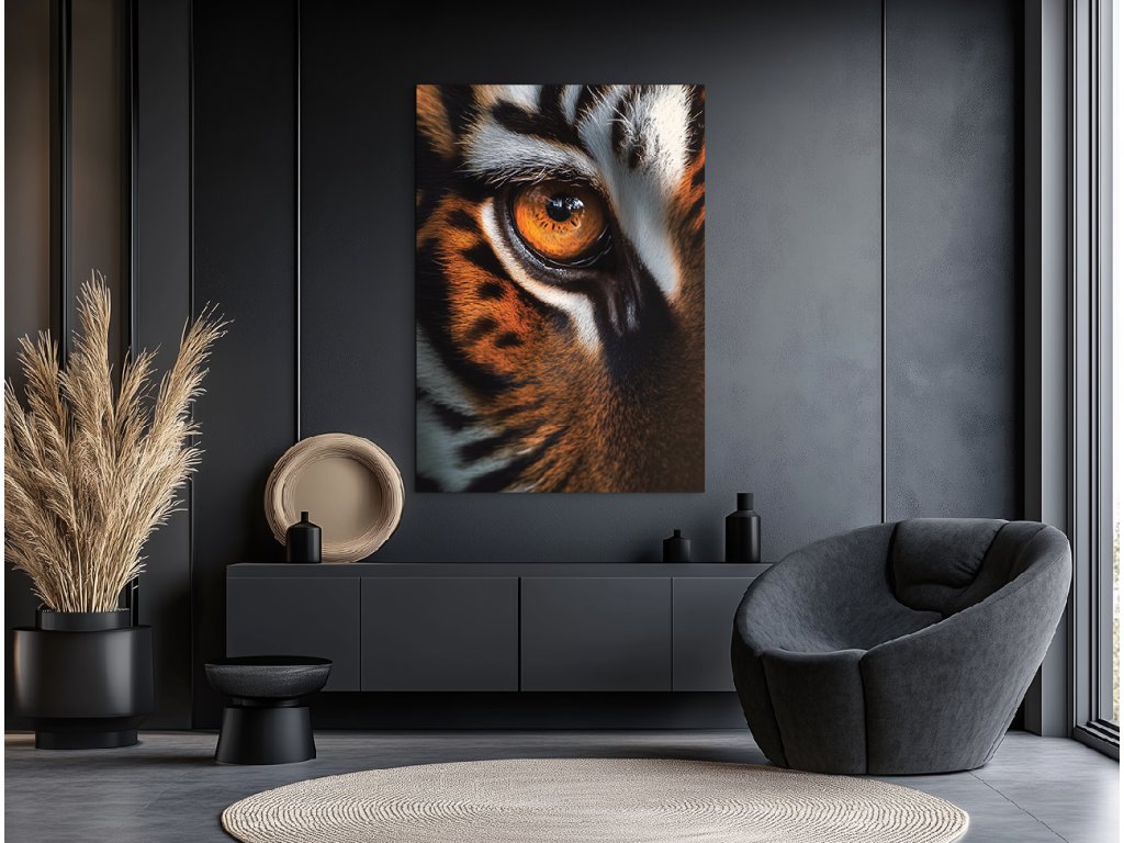 Oko tygra je obraz nabitý napětím a soustředěnou energií. Zachycuje intenzivní pohled šelmy – přesný moment, kdy se zastaví čas a příroda sleduje přes jediné, pronikavé oko. Detail srsti, struktury kůže a lesk zornice vytvářejí silný vizuální zážitek, který působí jako varování i fascinace zároveň. Ideální obraz pro ty, kteří vyhledávají symboly síly, intuice a odhodlání.
