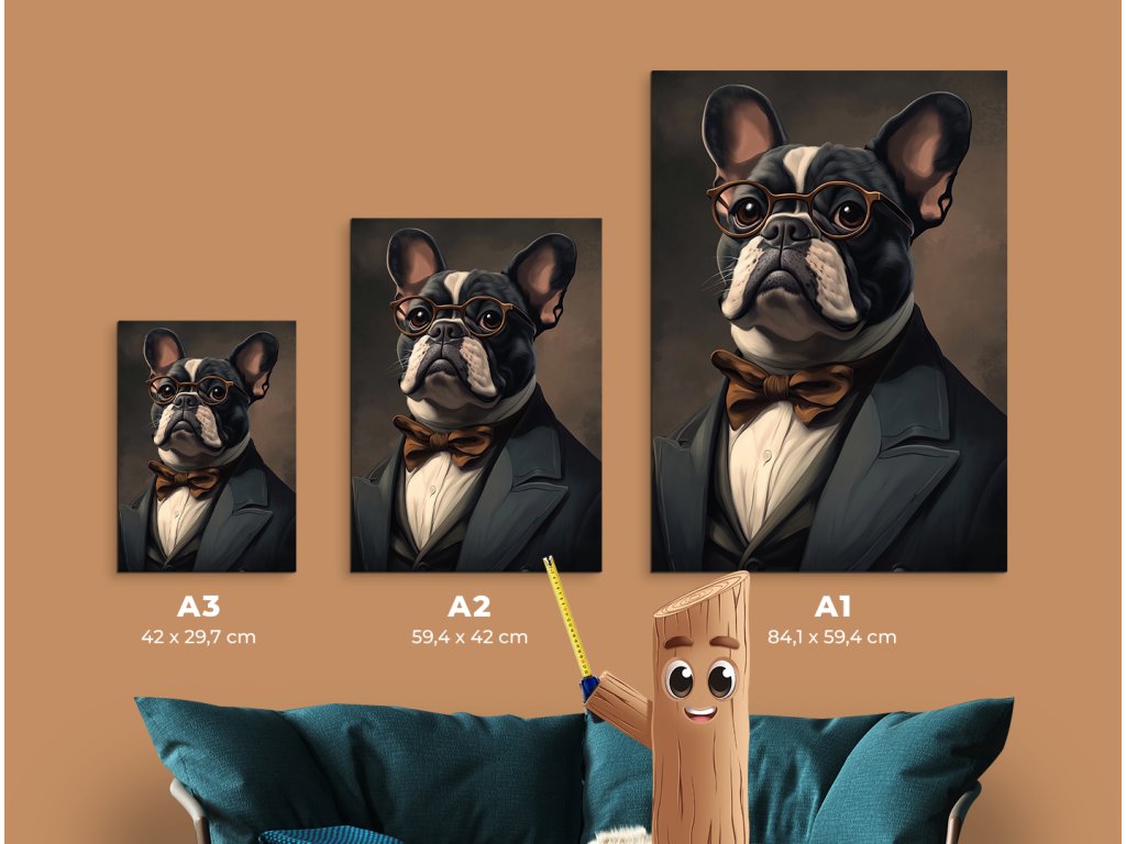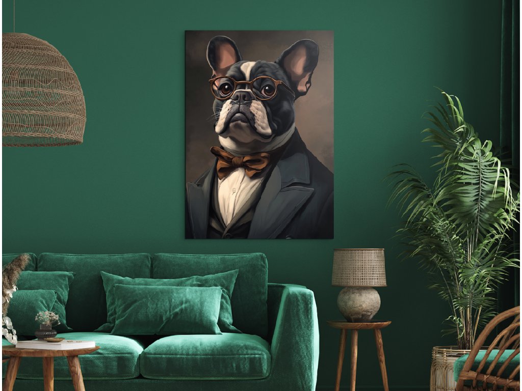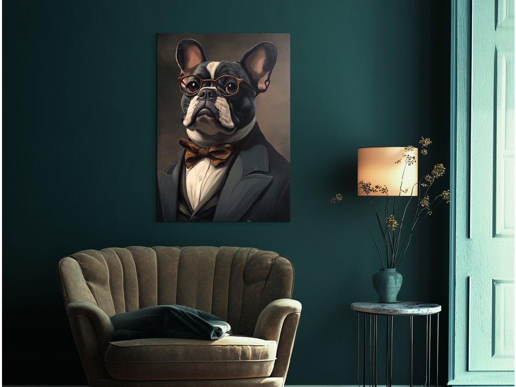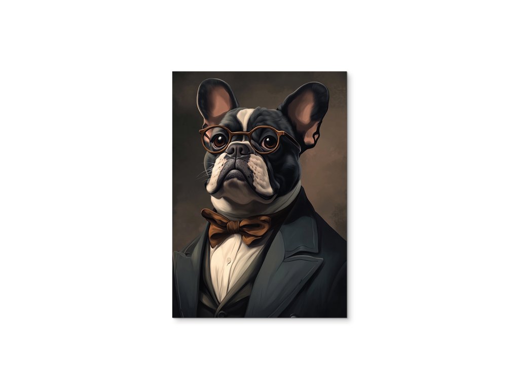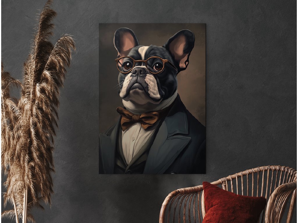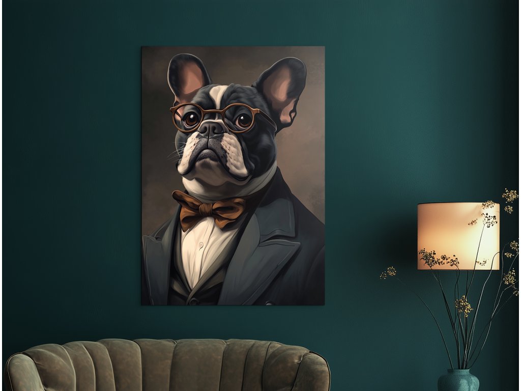 Pán Buldoček je stylový a zábavný portrét francouzského buldoka, který v obleku s motýlkem a kulatými brýlemi působí jako distingvovaný pán s vlastním názorem. Jeho ikonické „netopýří“ uši, plochý obličej a sebevědomý výraz v kombinaci s tmavým pozadím vytvářejí silný vizuální kontrast a nezaměnitelnou atmosféru. Ideální obraz do obývacího pokoje, pracovny či stylového prostoru, kde se oceňuje osobitost, design a troška psího humoru.