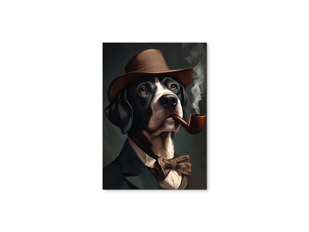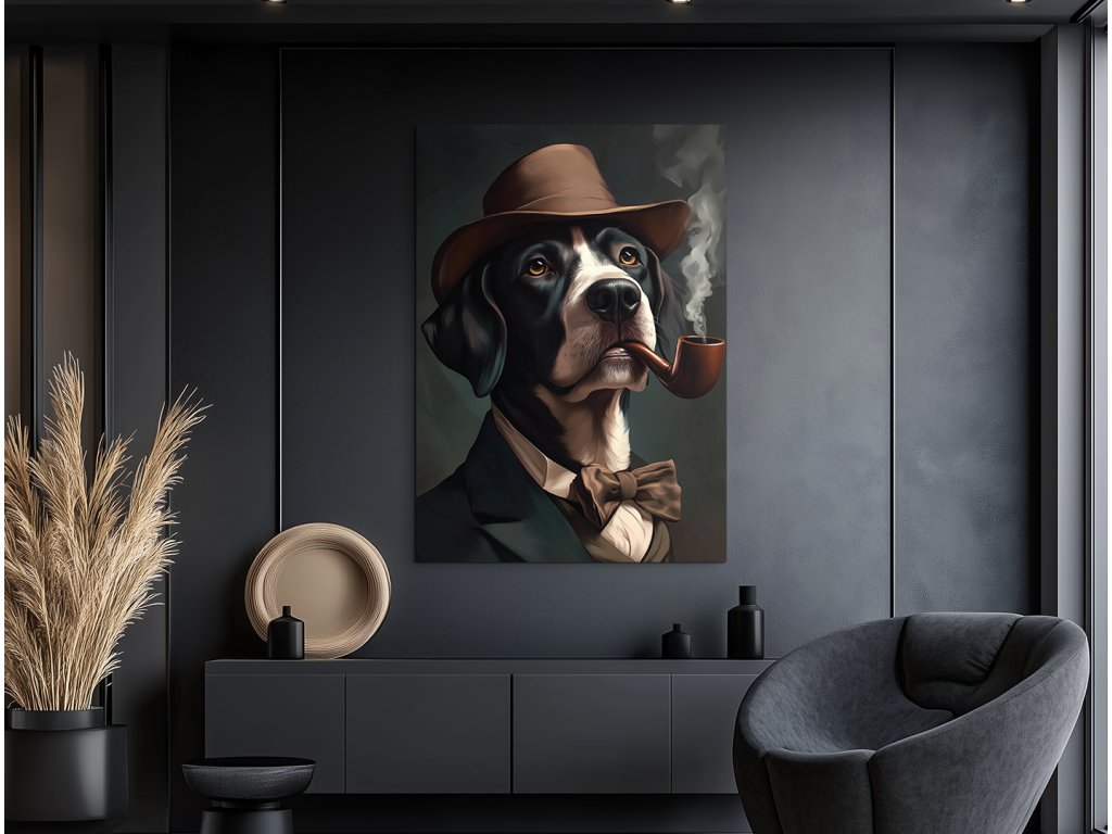 Pán Pointer se stylem je portrét psa plemene anglický pointer, který by klidně mohl sedět ve starém anglickém klubu s knihou a sklenkou brandy. Oblečený v tmavém obleku, s motýlkem, kloboukem a dýmkou v tlamě působí jako skutečný gentleman s vážnou tváří a jiskrou moudrosti – ideální obraz pro milovníky psů a interiérů s charakterem.