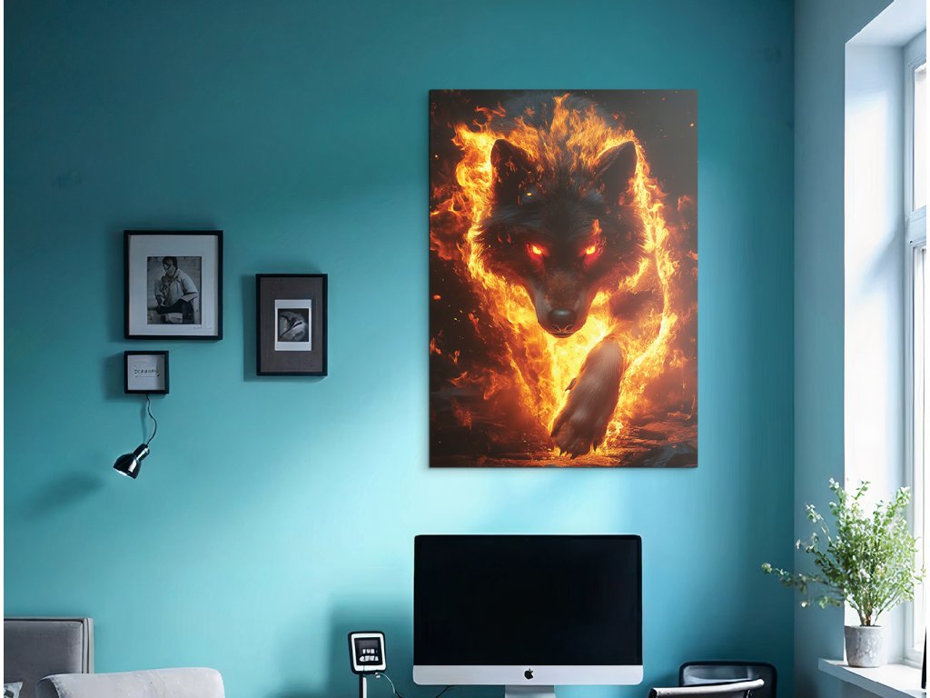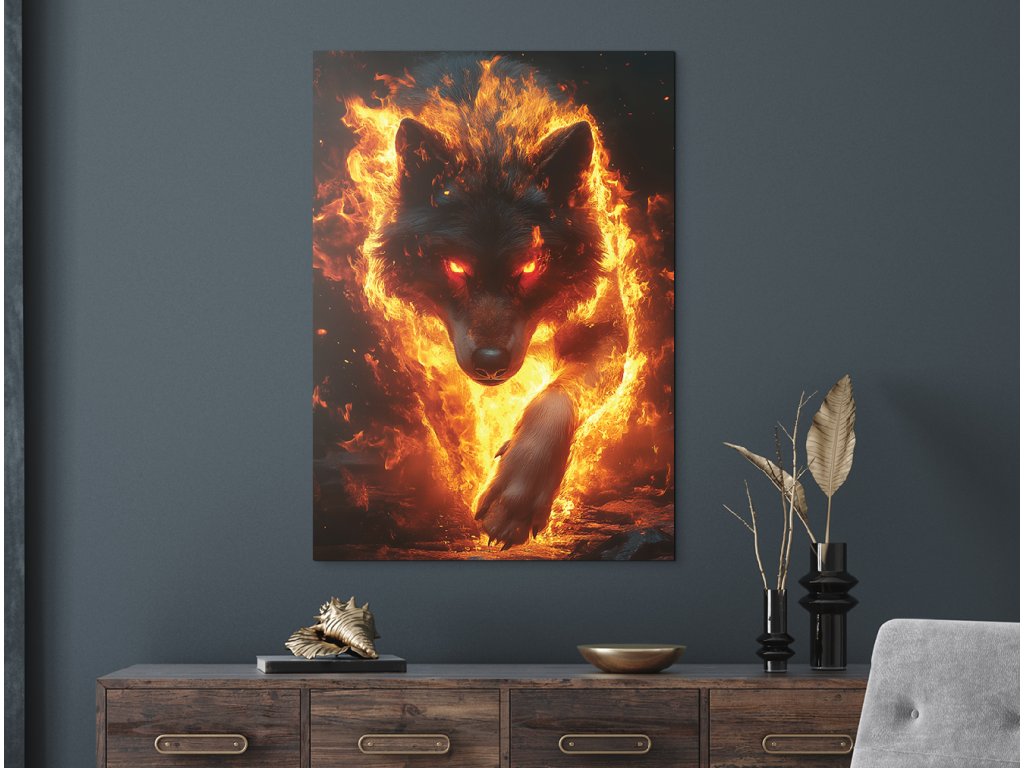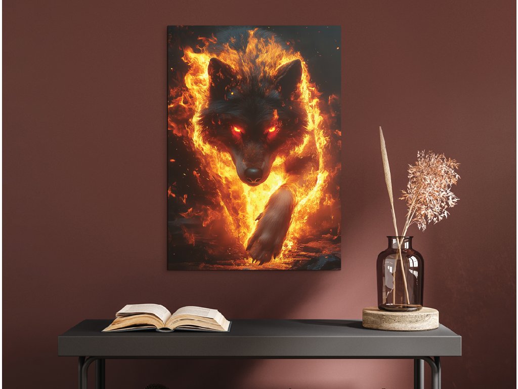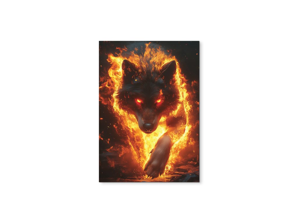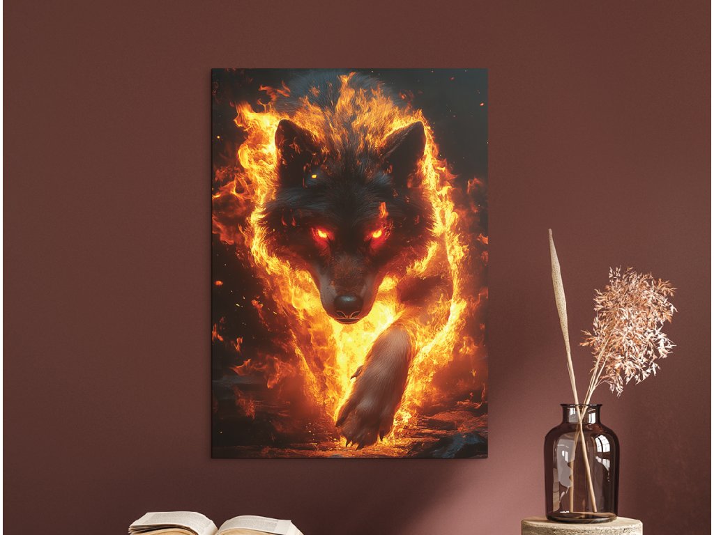 Plamen bestie je strhující obraz zachycující vlkodlaka s ohnivýma očima, který vystupuje z realisticky malovaných plamenů. Jeho silueta se rýsuje proti tmavému pozadí, ze kterého sál napětí a nebezpečí. Oči září jako žhavé uhlíky, zatímco plameny obklopují jeho tělo – symbolizujíc přeměnu, hněv a nespoutanou sílu. Tento obraz je ideální pro milovníky fantasy, mýtů a temné energie.