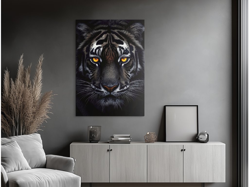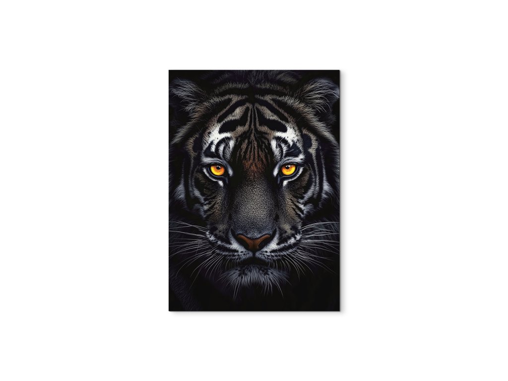 Stín dravce zachycuje intenzivní pohled tygra, který se skrývá v temnotě. Na obraze vyniká jen jeho hlava – ponořená do stínu, přičemž jediným světlem jsou jeho pronikavé, zářící oči. Atmosféra je napjatá a hypnotická, jako by šelma sledovala kořist v absolutním tichu. Tento obraz vyzařuje respekt, sílu a přirozenou autoritu tygra, stvořenou z temnoty a soustředění.