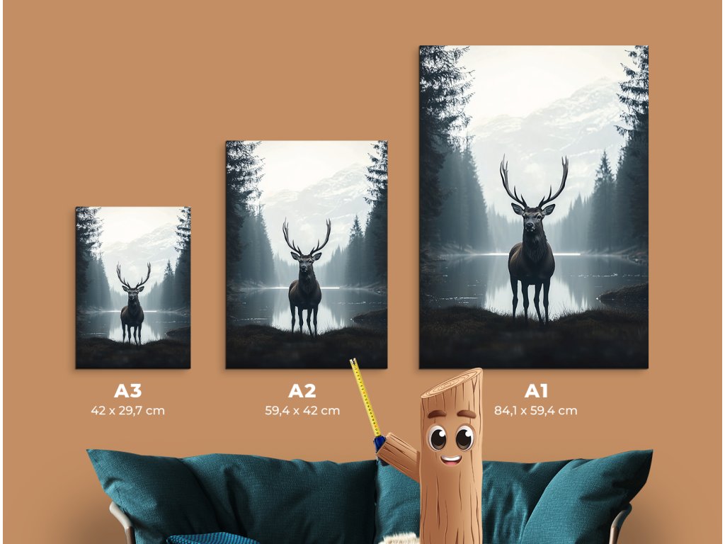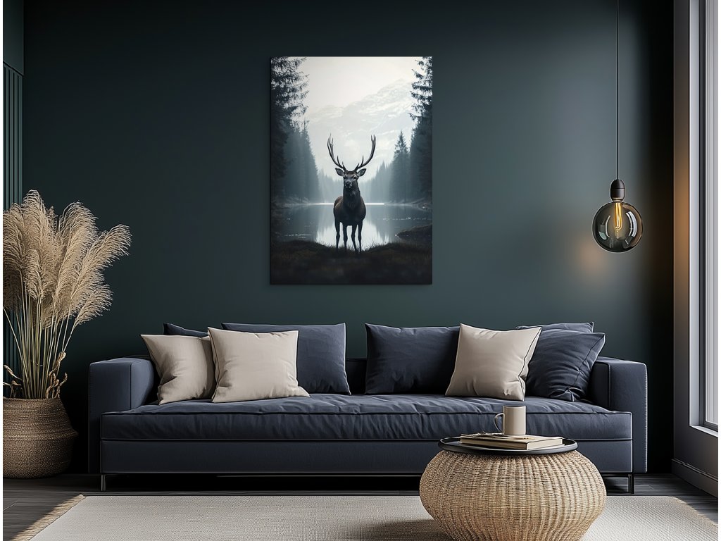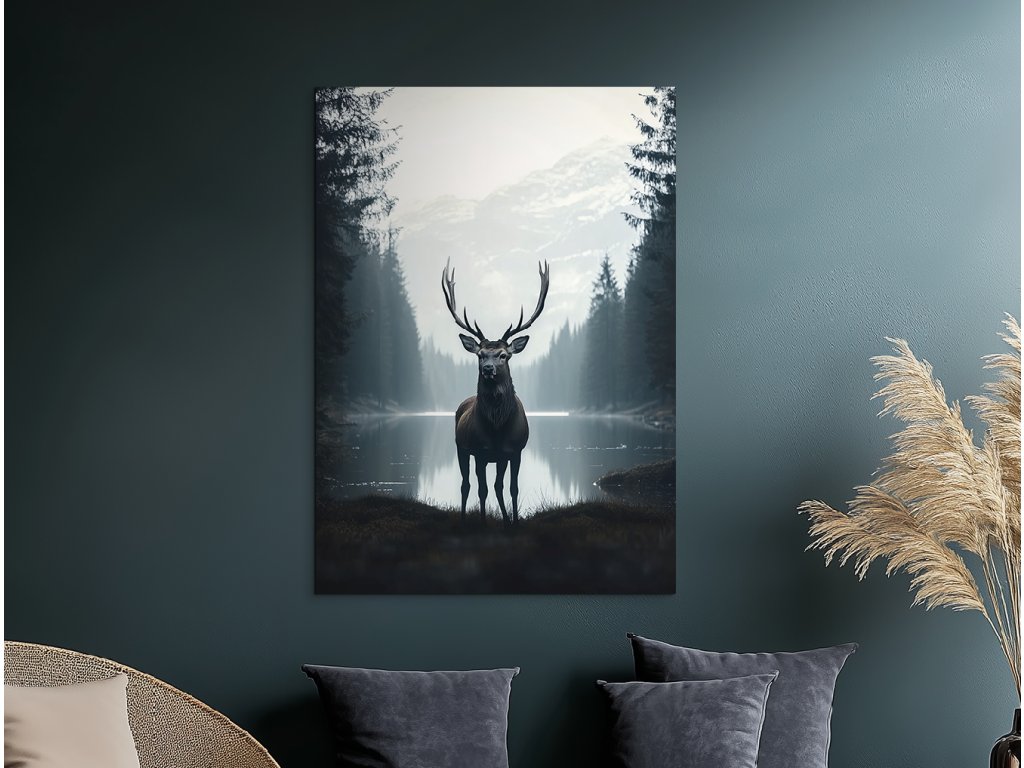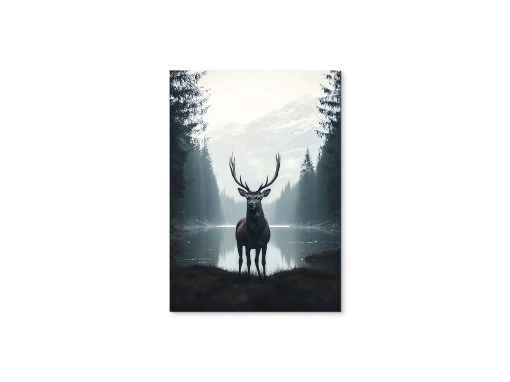 Ticho studeného jezera je realisticky pojatý obraz, který zachycuje mohutného jelena stojícího v popředí u tichého, chladného jezera obklopeného přírodou. Odraz vody, jemné světlo a detailní kresba vytvářejí pocit skutečné přítomnosti a harmonie s okolím. Obraz působí klidně a zároveň silně – ideální do interiéru, který touží po spojení s divokou přírodou a klidem severské krajiny.