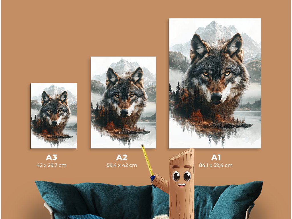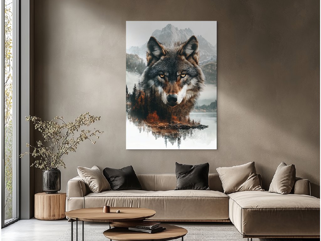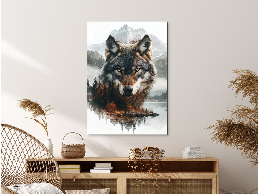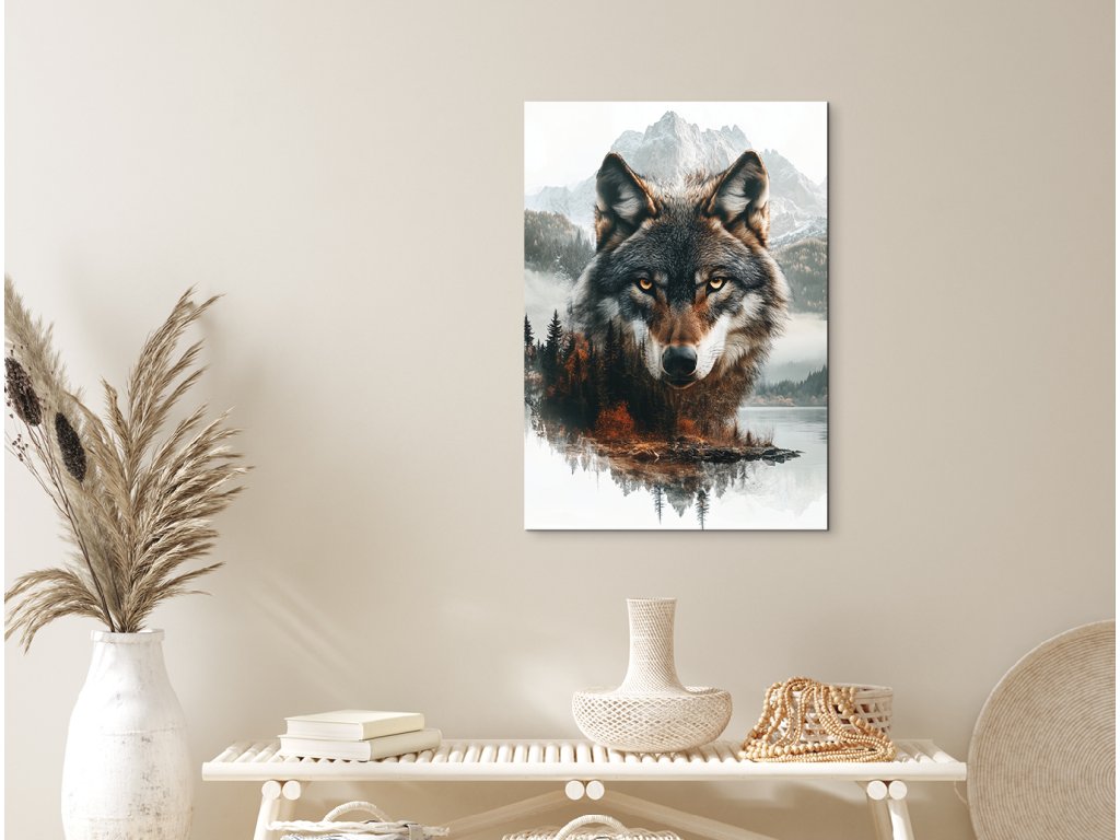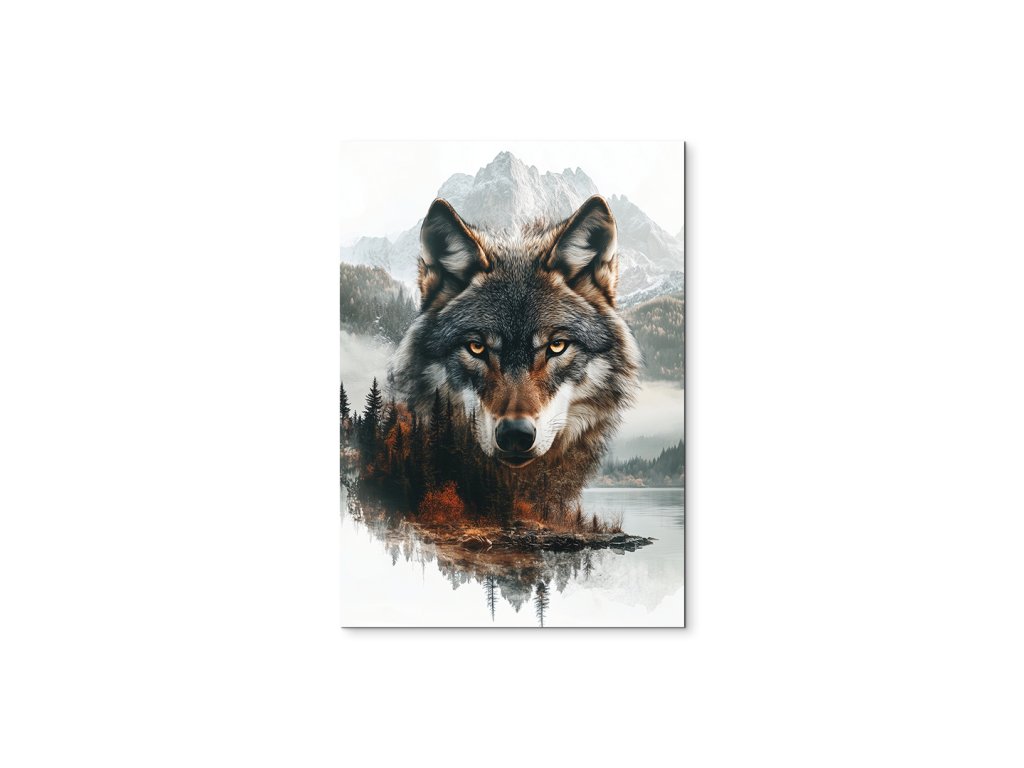 Vlčí duše divočiny je vizuálně působivý obraz, ve kterém se majestátní vlk stává součástí samotné přírody. Jeho pronikavé žluté oči hledí vpřed, ale jeho srst skrývá celou zemi - zasněžené horské štíty, husté jehličnaté lesy a klidné jezero, které odráží nebe. Odraz pod vlkem umocňuje spojení mezi zvířetem a přírodním světem, jako by byl vlk ztělesněním země, kterou chrání. Obraz působí symbolicky, klidně a zároveň silně – jako připomínka jednoty mezi přírodou a jejím divokým duchem.