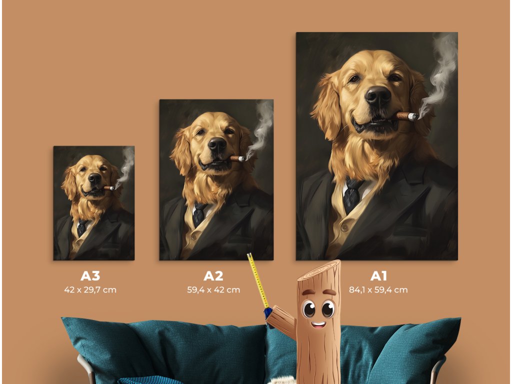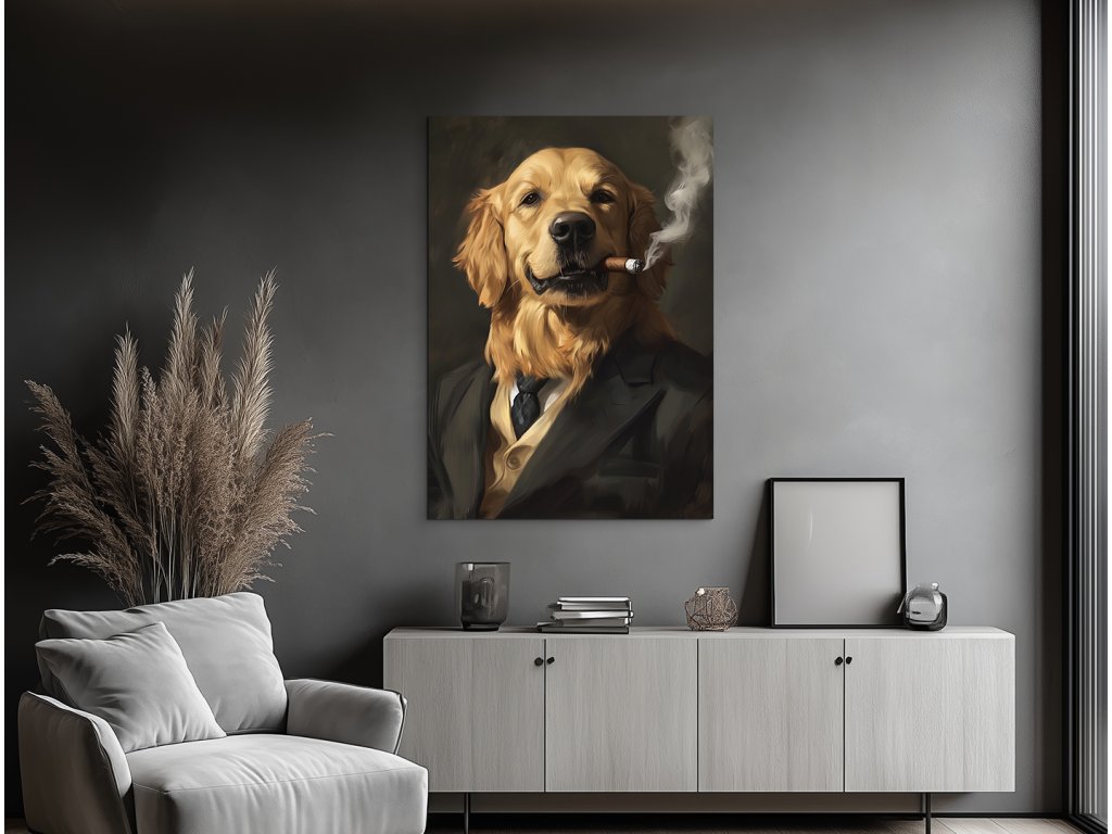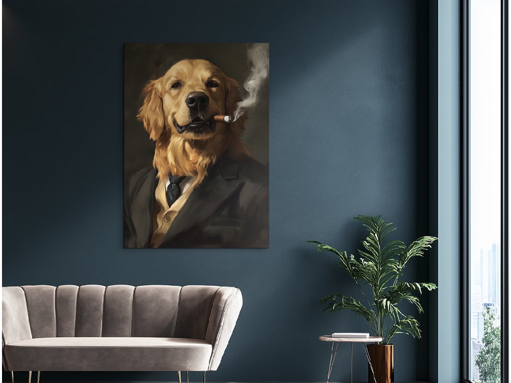 Zlatý retrívr s charismatem je portrét psa v elegantním obleku, který si s úsměvem vychutnává doutník a působí mimořádně spokojeně se životem. Jeho výraz plný pohody a šarmu doplňuje stylové oblečení a klidná atmosféra obrazu, která okamžitě navodí dobrou náladu. Tento originální obraz je ideálním doplňkem do moderního interiéru, zejména pro milovníky psů, humoru a umění s osobností.