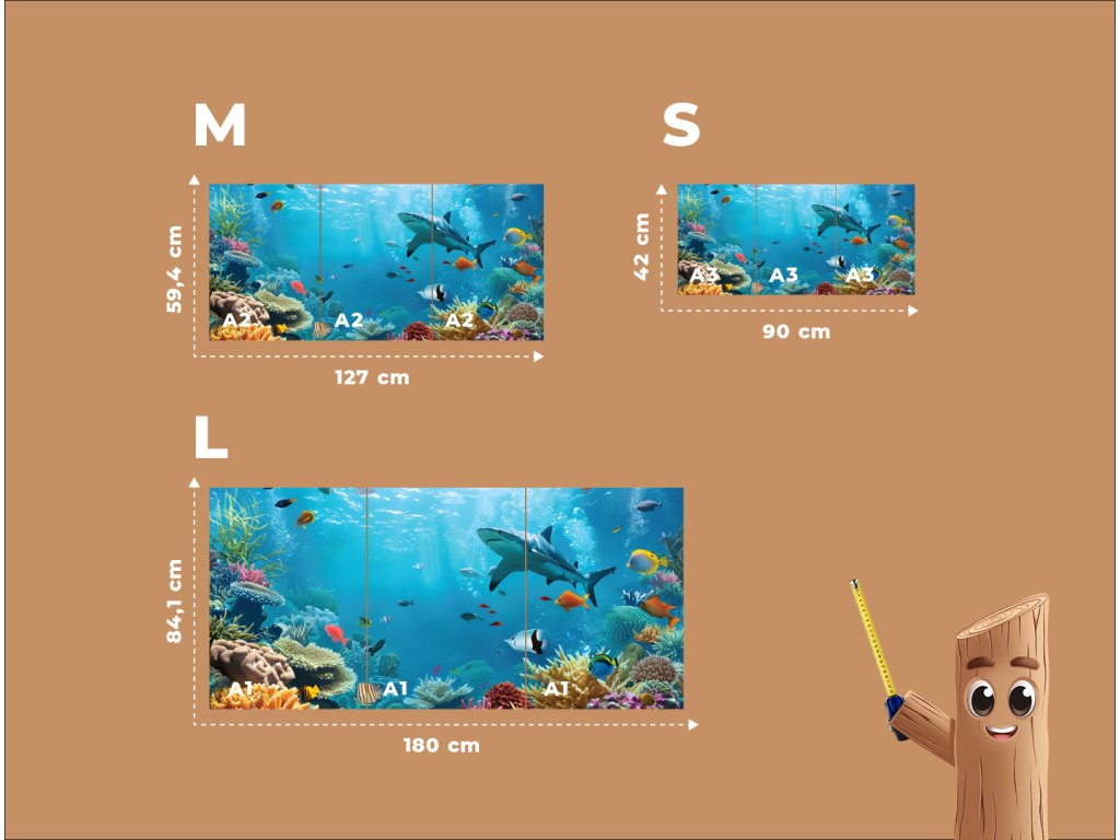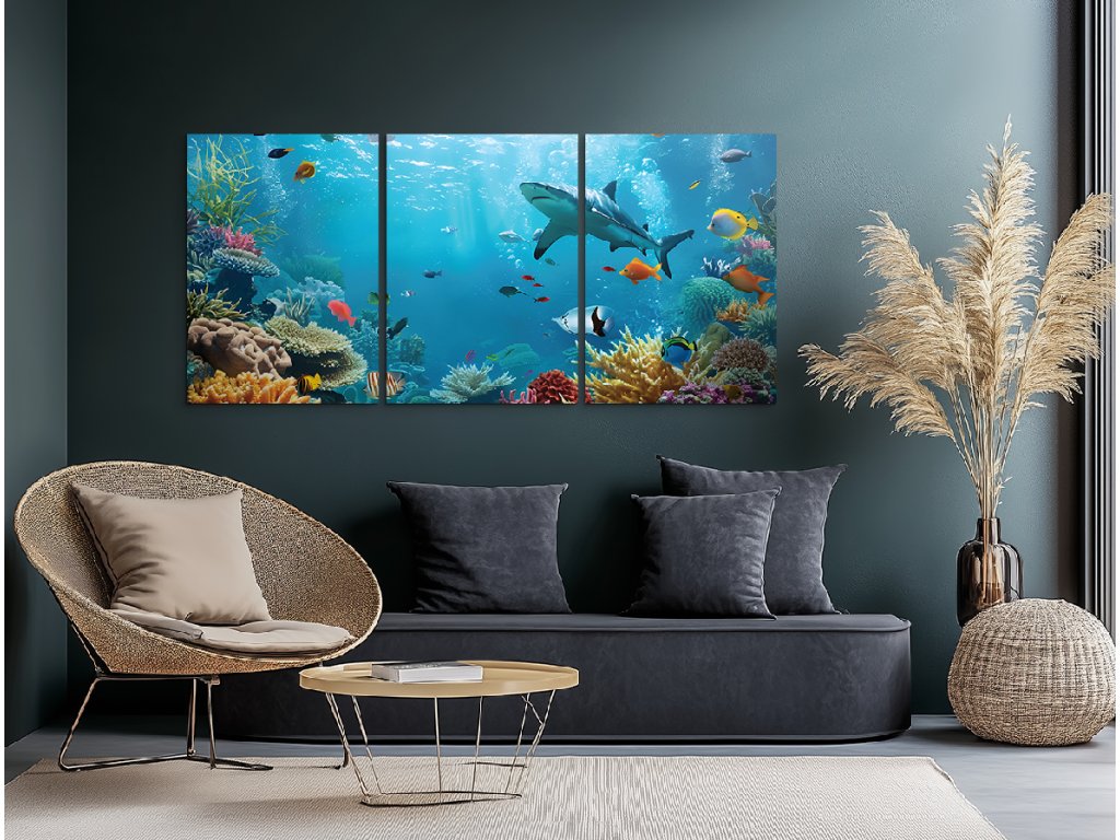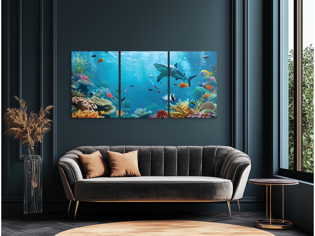 Klidný život v moři je třídílný obraz, který vás zavede do barevného světa pod hladinou oceánu. Pestré ryby, elegantně plovoucí žralok a korály různých tvarů a odstínů vytvářejí harmonickou mořskou krajinu plnou pohybu a života. Obraz vyzařuje klid a rovnováhu.