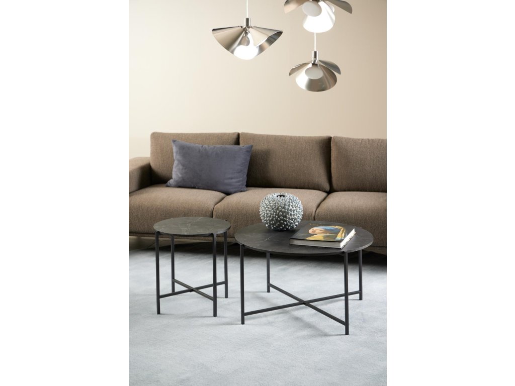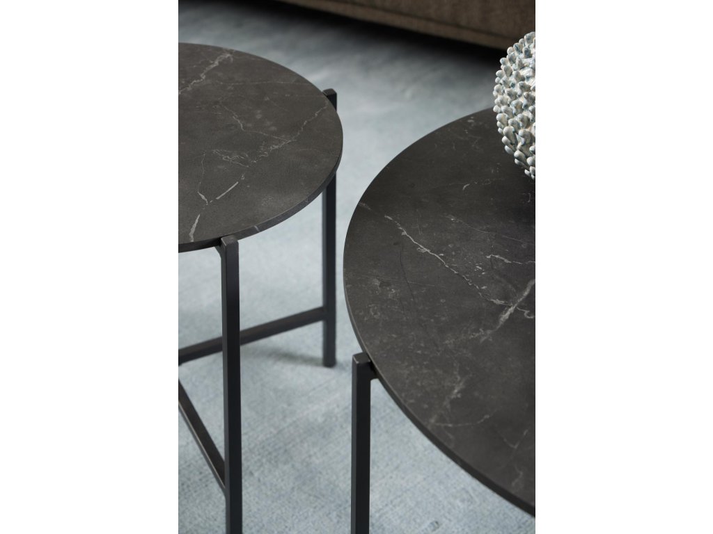 Kulatý příruční stolek Lamoine, Ø40x45 cm, vyniká čistým tvarem a promyšlenými detaily. Kulatá deska s matným černým mramorovým vzhledem vytváří elegantní a klidnou atmosféru. Jemná, ale stabilní ocelová podnož s hrubým práškovým nástřikem sahá až k prknu, čímž přidává vizuální zájem. Stolek je ideální pro umístění lampy, rostliny nebo šálku kávy.