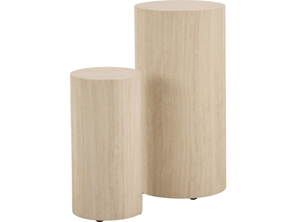 Souprava Dice se skládá ze dvou kulatých stolků v dekoru béžového travertinu. Travertinový design dodává noblesní nádech, který vynikne v každé místnosti. Stolky lze použít jako příruční či dekorační. Skvělé jako doplněk do obývacího pokoje.