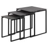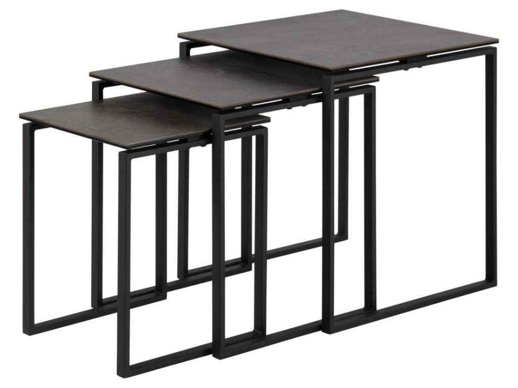 Stolky Katrine nabízejí soupravu tří praktických kousků v hranatém tvaru. Povrch z hrubé černé keramiky a stabilní ocelové podstavce zajišťují stabilitu i styl. Hnízdový design umožňuje šetření místa a flexibilní uspořádání.