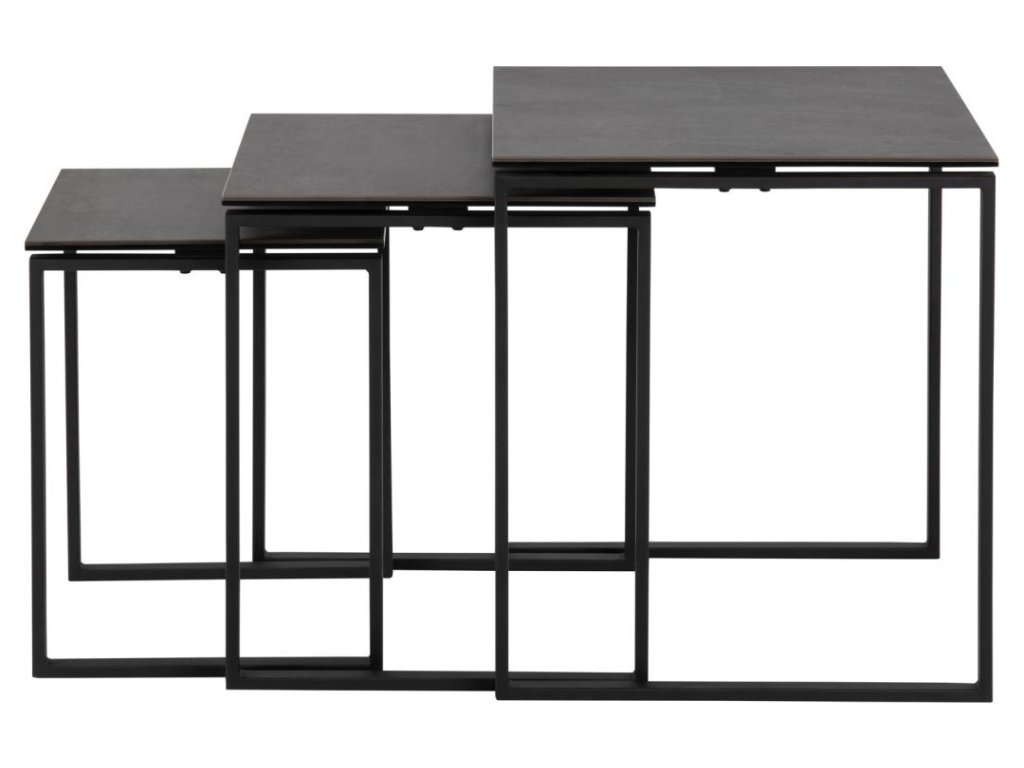 Stolky Katrine nabízejí soupravu tří praktických kousků v hranatém tvaru. Povrch z hrubé černé keramiky a stabilní ocelové podstavce zajišťují stabilitu i styl. Hnízdový design umožňuje šetření místa a flexibilní uspořádání.