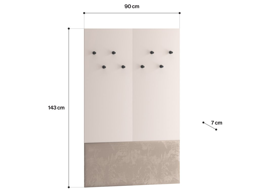 Věšákový panel Voco 07 je elegantním a praktickým doplňkem do předsíně, který díky rozměrům 90 × 7 × 143 cm nabízí dostatek místa pro odkládání svrchního oblečení. Panel je vybaven až 8 černými věšáky, které unesou kabáty, bundy či tašky celé rodiny. Spodní část je čalouněna do měkkého béžového veluru, který působí moderně a zároveň chrání stěnu před poškozením od obuvi nebo tašek.