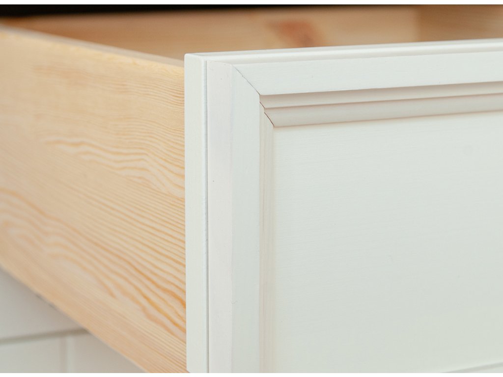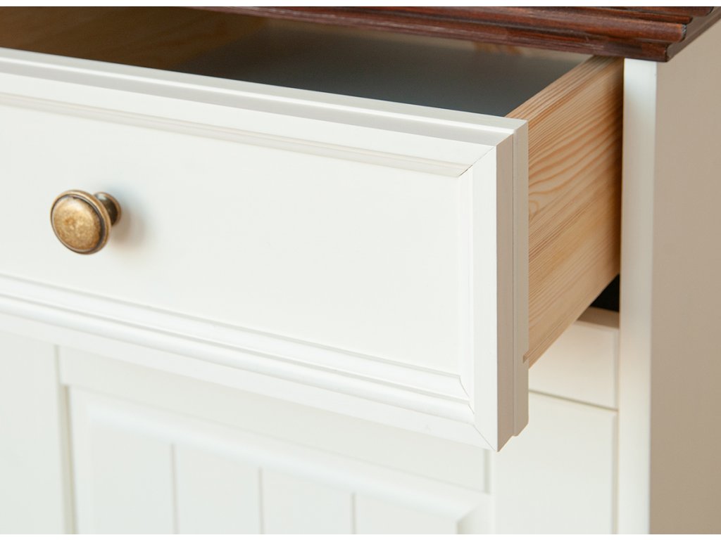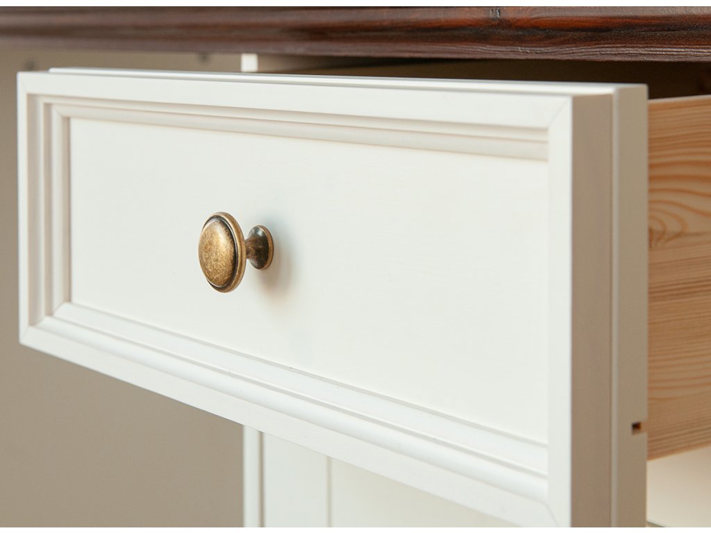 Borovicový stůl se skládá z jedné skříňky a zásuvky na lištách se systémem tichého zavírání. Eleganci dodávají detaily jako staré stříbrné úchytky, zdobená horní část a podstavec. Dřevěná deska stolu je obklopena hlubokou frézou a sokl, na kterém stůl spočívá, není jen ozdobným prvkem, ale zajišťuje také trvanlivost celé konstrukce.