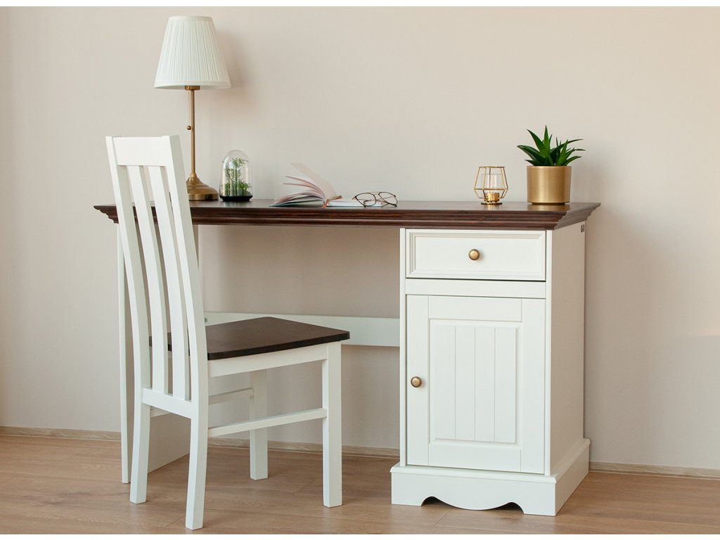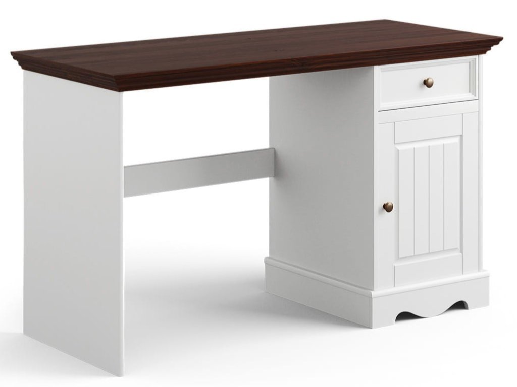 Masivní psací stůl Bellu je vyroben z masivního borovicového dřeva. Finská borovice je cenným materiálem díky jednoduchému zpracování a nepopiratelné trvanlivosti. Povrch stolu je pokryt bílou barvou a mořidlem na vodní bázi, jejichž krytí je cca 85%. To umožní vidět zrno ve dřevě, které je charakteristickým znakem každého kusu nábytku z přírodního dřeva. Pracovní deska je v barvě ořech.