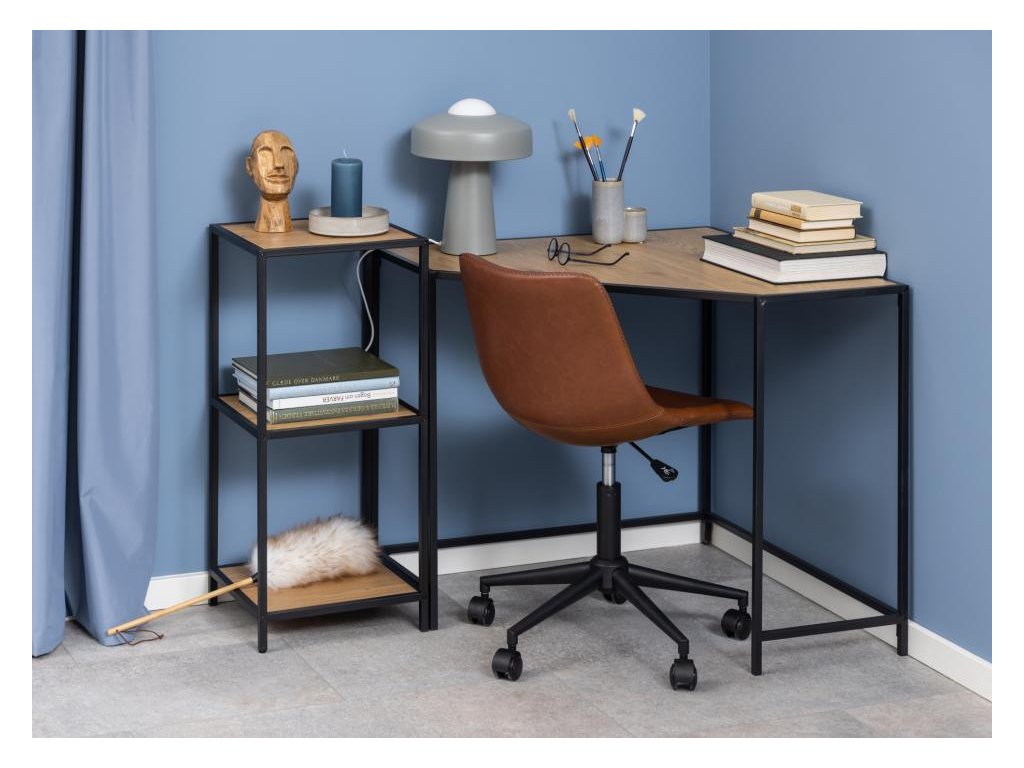 Kompaktní regál Seaford vnáší do prostoru poctivý loftový šmrnc: subtilní kostra z matné černé oceli jasně ohraničuje tvar, zatímco dvě police v dekoru matného divokého dubu vytvářejí příjemný rustikální. Díky výšce pouhých 82,5 cm působí vzdušně – perfektně se hodí vedle pohovky, pod obraz či do úzké předsíně. Hrubý práškový nástřik chrání kov před korozí, plastové krytky šetří podlahu a melaminový povrch polic se udržuje jedním tahem hadříku.