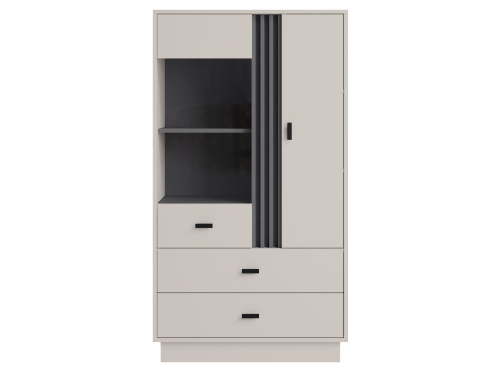 Elegantní regál do obývacího pokoje, je vyroben v moderním designu. Kombinace barev kašmírově béžové a antracit vnese do interiéru příjemný design. Regál je snadno kombinovatelný s jiným nábytkem z kolekce Allmo. Regál je vyroben z laminované desky zakončené ABS hranami.