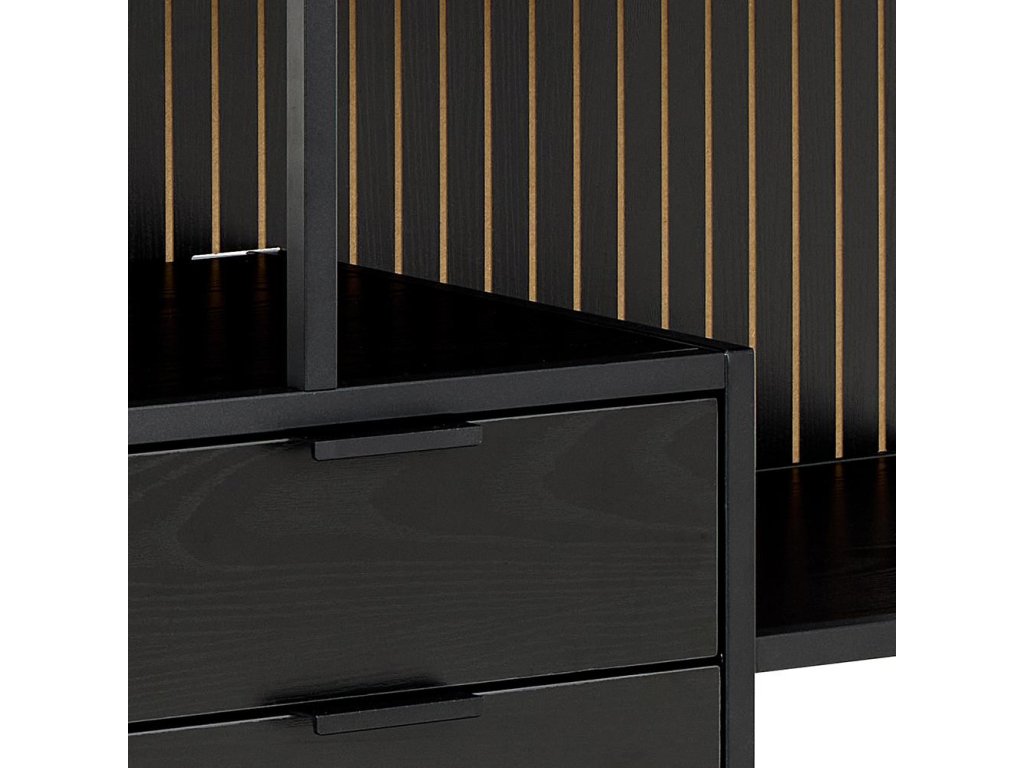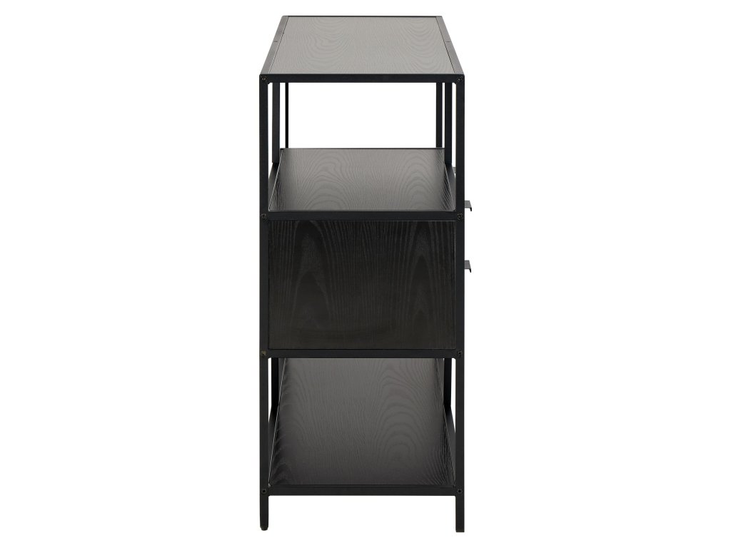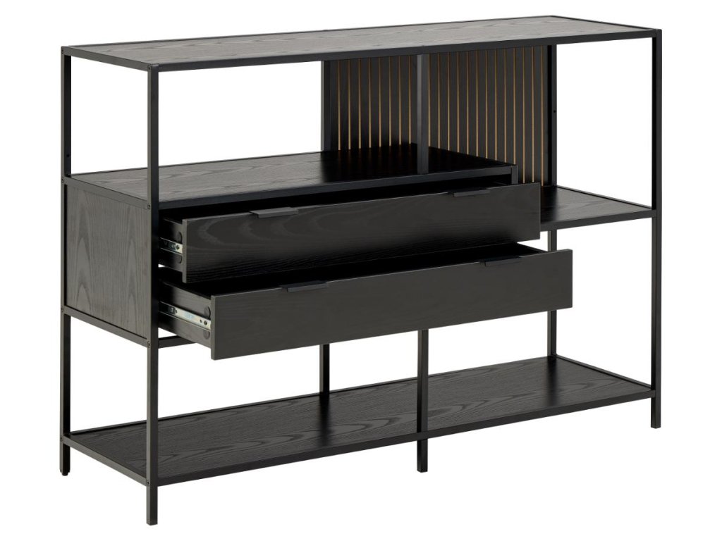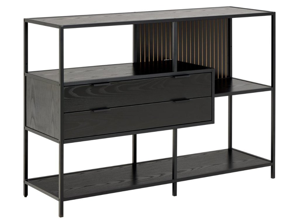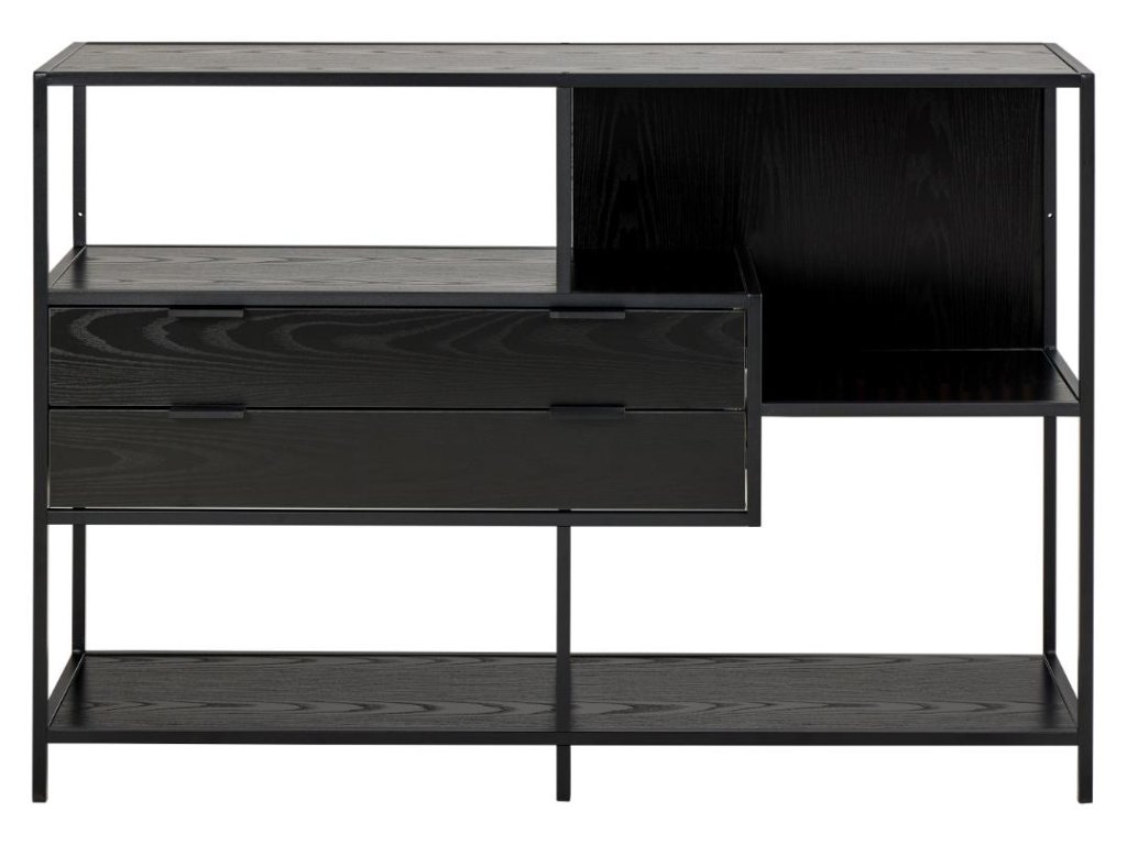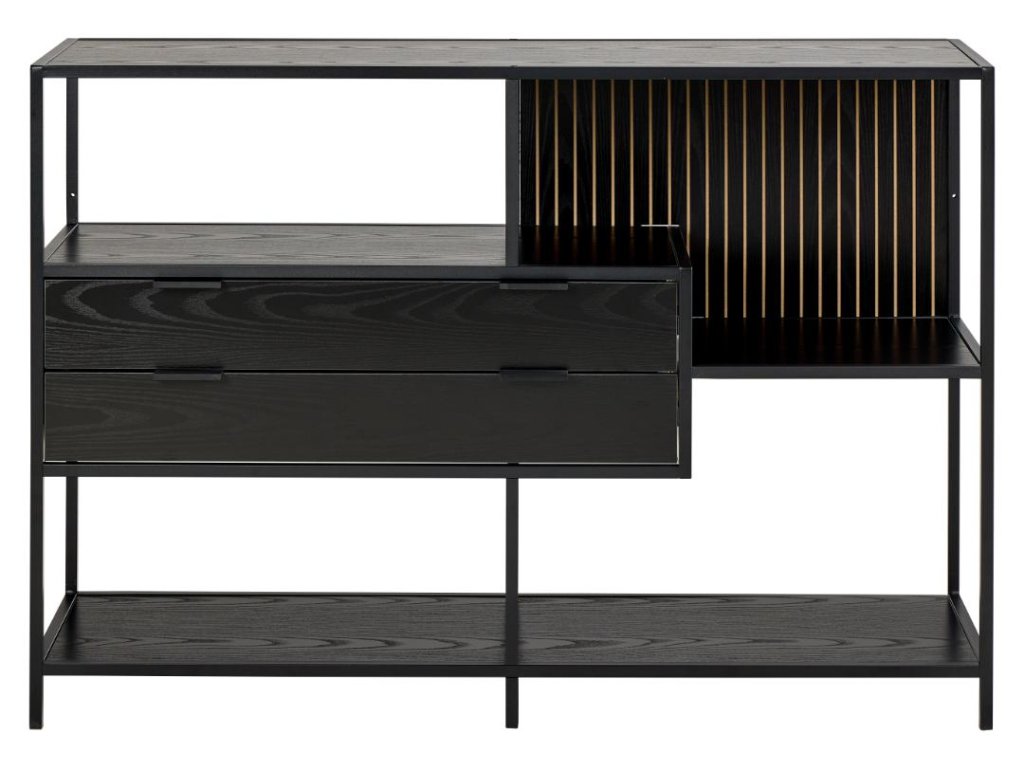 Dominantní černá dodává regálu Seaford (114 × 35 × 78 cm) industriální výraz. Matné police a zásuvky v dekoru černého jasanu ladí tón v tón s ocelovým rámem v černé práškově lakované úpravě, takže nábytek snadno zapadne do skandinávských, minimalistických i moderních interiérů, kde oceníte klidný, harmonický.