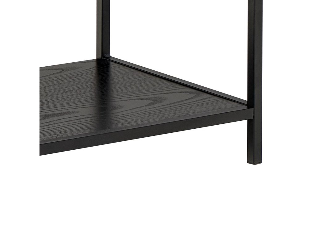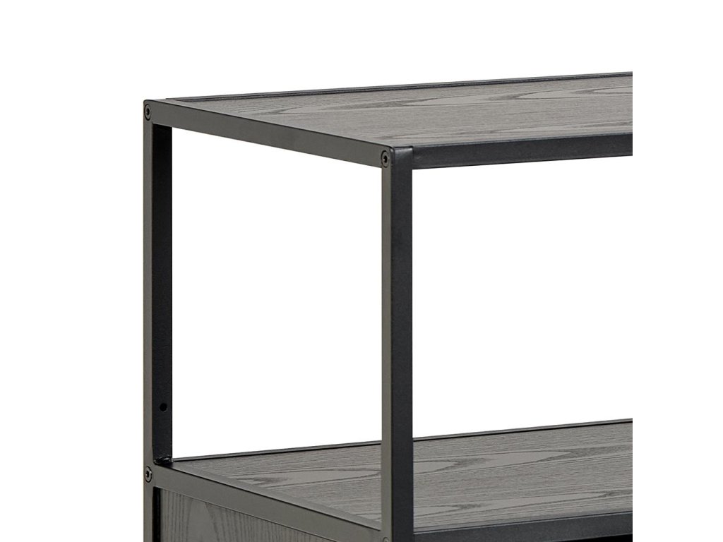 Knihovna Seaford spojuje moderní industriální vzhled s praktickou funkčností. Černý ocelový rám s práškovým nástřikem doplňují 2 zásuvky a 3 police v popelavě černém melaminu. Asymetrické prvky a oboustranný zadní panel z ní dělají stylový kousek ideální pro knihy, dekorace či úložné doplňky.
