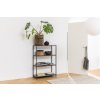 Každá police unese až 18 kg, takže na stabilní konstrukci bezpečně vystavíte i těžší předměty. Plastové krytky na nohou (výška 6,8 cm) chrání podlahu, melaminový povrch polic se snadno udržuje a práškový lak chrání ocel před poškrábáním. Výsledkem je odolný, snadno čistitelný kus nábytku, který dodá prostoru charakter i praktické úložiště.