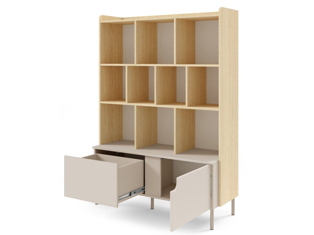 Široký regál Positano PO5 v kombinácii dub mavelie / macadamia pôsobí jemne, svetlo a prirodzene. Svetlý dubový dekor v spojení s krémovým odtieňom vytvára harmonický celok. Otvorený regál dodáva priestoru vzdušnosť a umožňuje vystaviť obľúbené predmety. Spodné úložné časti prinášajú praktické riešenie pre každodenné používanie. Minimalistický dizajn dopĺňa push to open systém pre čistý vzhľad bez úchytiek.