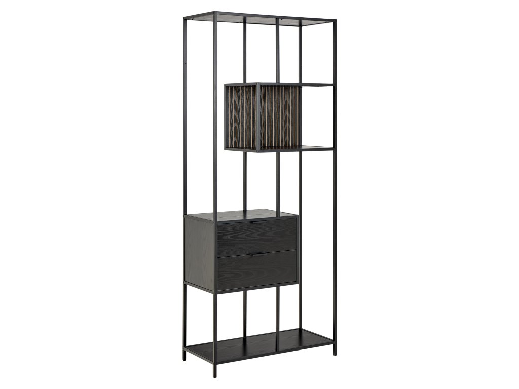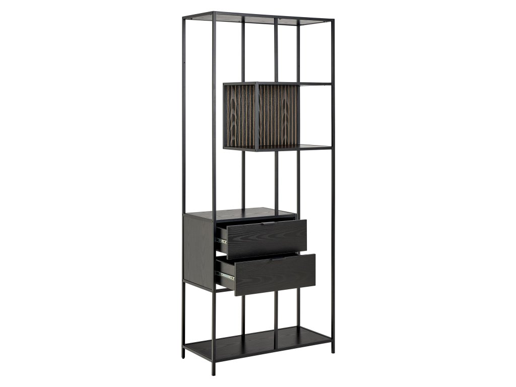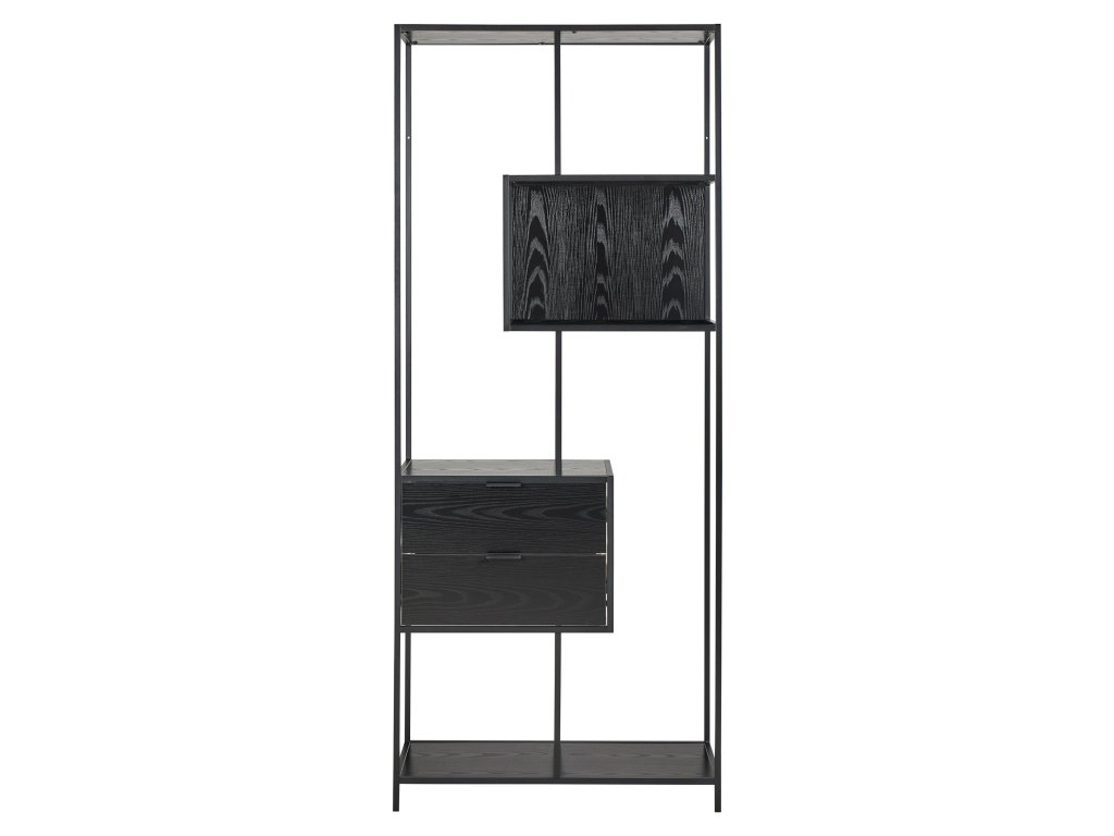 Knihovna Seaford 2S spojuje moderní industriální vzhled s praktickým úložným prostorem. Černý ocelový rám s práškovým nástřikem doplňují 2 zásuvky a 4 police v popelavě černém melaminu. Asymetrické detaily a oboustranný zadní panel dodávají knihovně stylový charakter, zatímco odolné, snadno udržovatelné materiály zaručují dlouhou životnost.