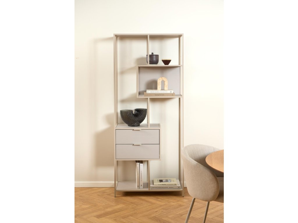 Moderní regál Seaford v šedém provedení nabízí stylový vzhled a funkčnost. Hrubý melamin a ocelový rám zajišťují pevnost a dlouhou životnost. Asymetrické řešení polic oživí prostor. Obsahuje 2 zásuvky pro skrytý úložný prostor.