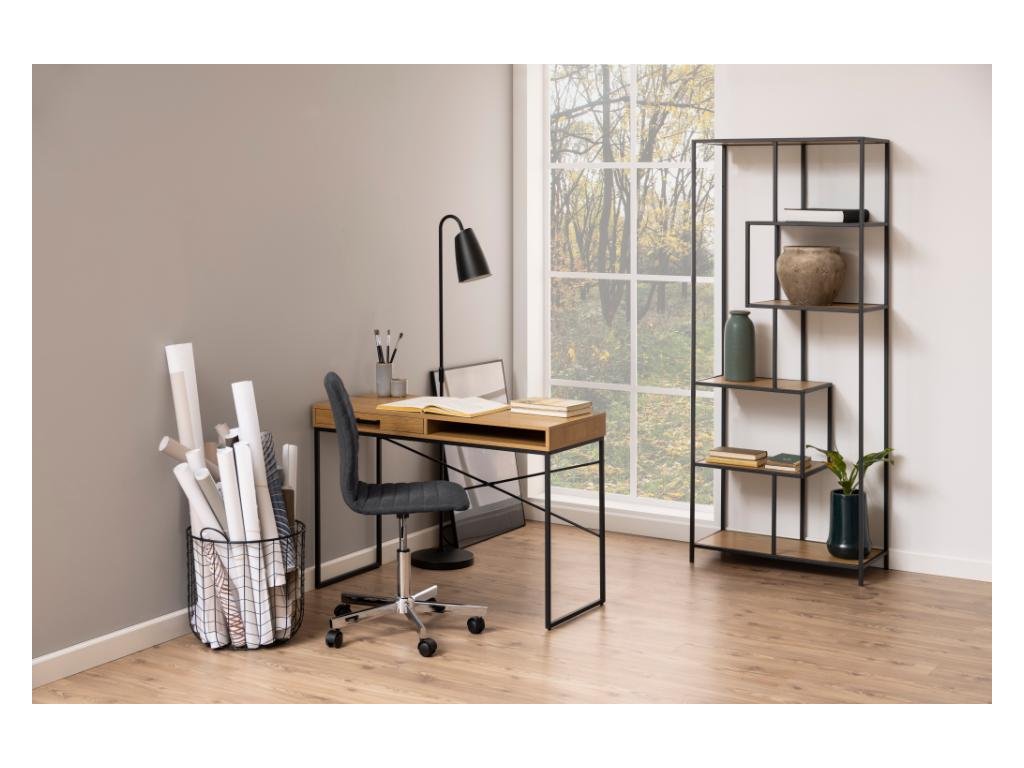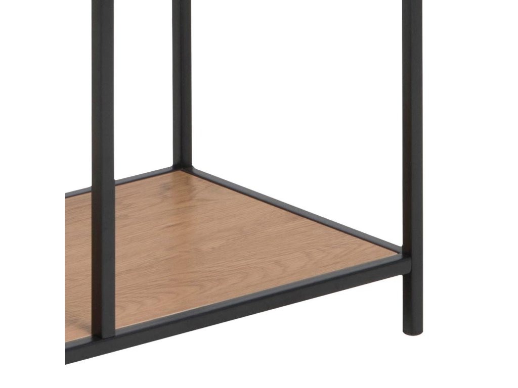 Kolekce Seaford přináší autentický loftový charakter do každé místnosti díky kombinaci matné černé oceli s práškovým nástřikem a kontrastních povrchů z dubu divokého či sonoma dubu, skla. Jemně zúžené profily rámů, asymetrické rozložení polic a vzdušná podnoží dodávají nábytku lehkost, zatímco surové ocelové detaily zaručují odolnost a dlouhou životnost. Jednotný materiálový jazyk přechází od minimalistických příručních stolků a servírovacích vozíků až po robustní vitríny a knihovny, takže v interiéru vždy působí harmonicky.