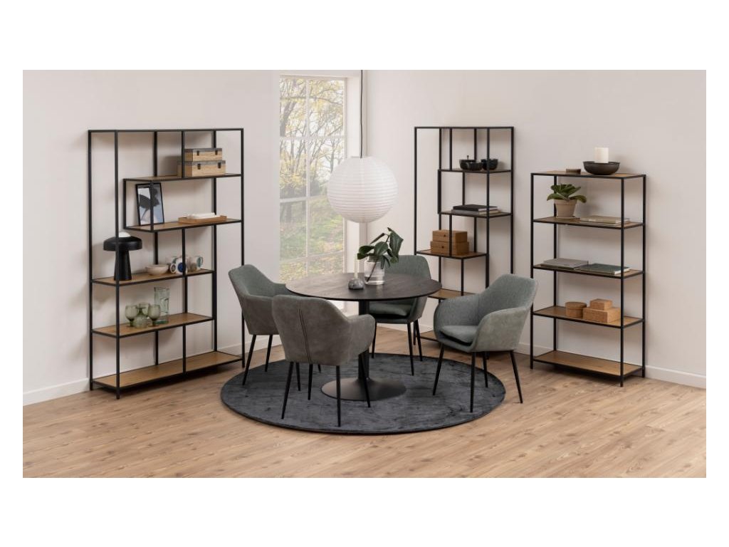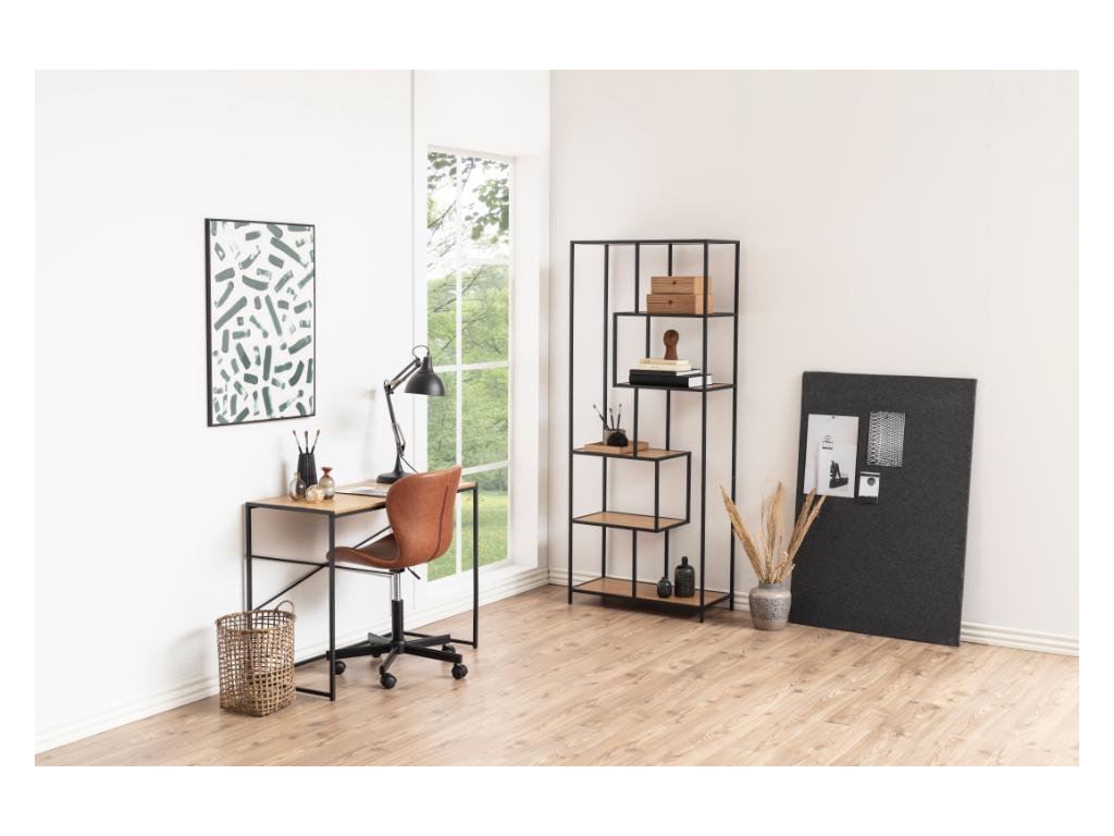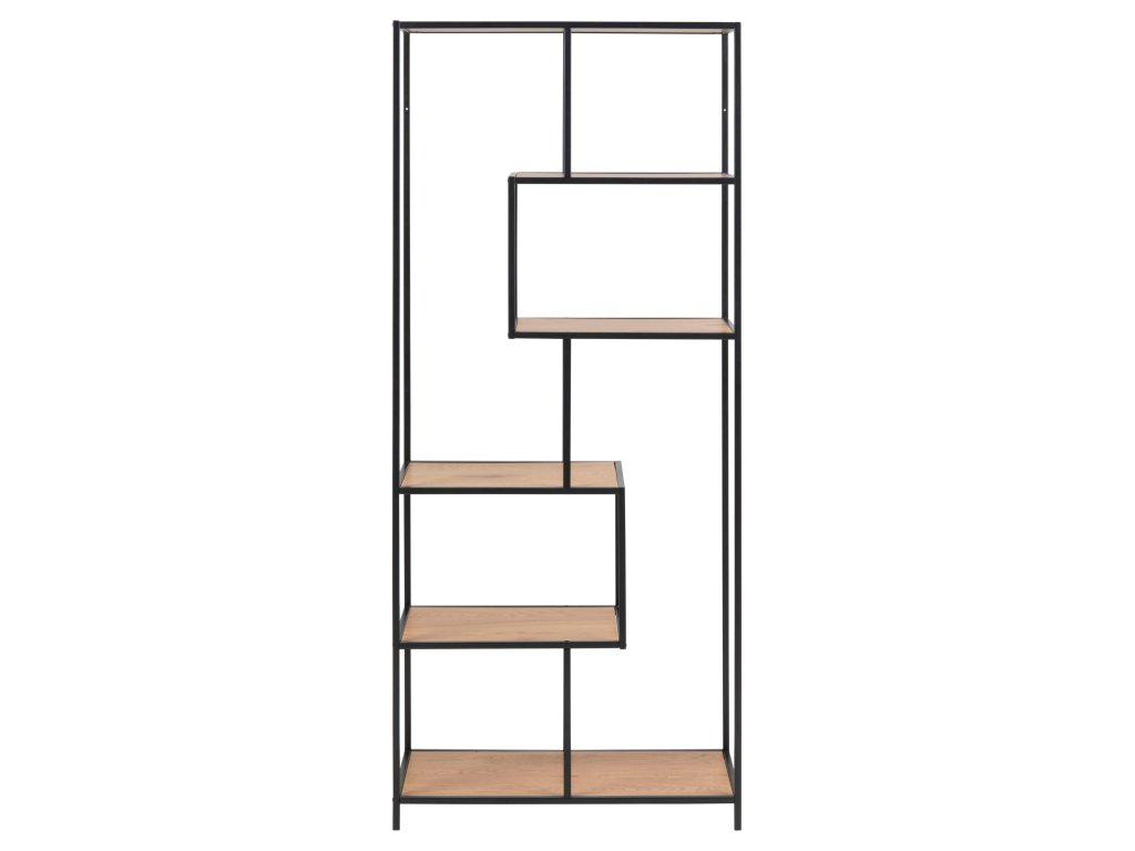 Vysoký regál Seaford je stylovým řešením pro vertikální uspořádání úložného prostoru. Černá kovová kostra s asymetrickým rozložením a dubový povrch vytvářejí harmonickou kombinaci.