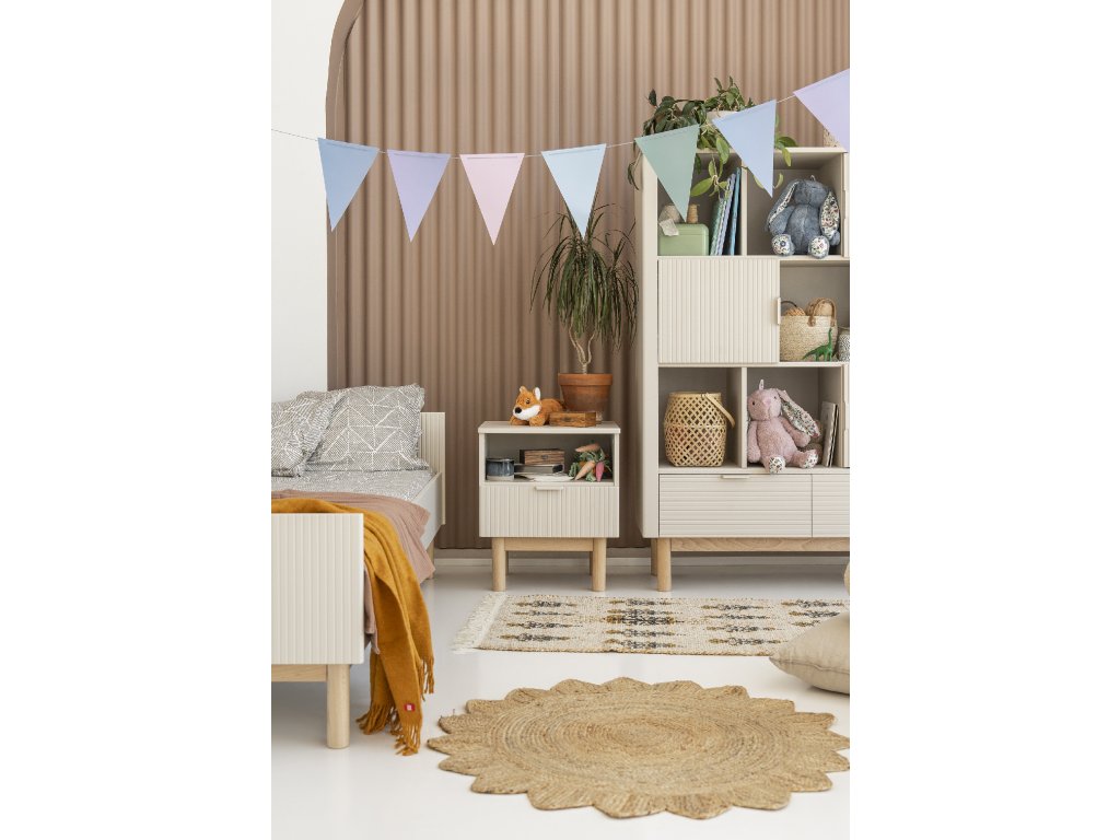 Velký béžový regál Miloo s asymetricky řešenými policemi a uzavřeným úložným prostorem je ideální volbou pro praktické i estetické uspořádání dětského pokoje. Je dostatečně prostorný na knihy, hračky i dekorace, které dítě chce mít po ruce. Jemný béžový odstín působí hřejivě a zároveň neutrálně, takže se snadno sladí s jakýmkoli stylem interiéru.