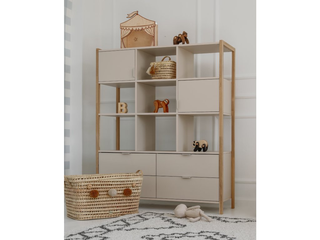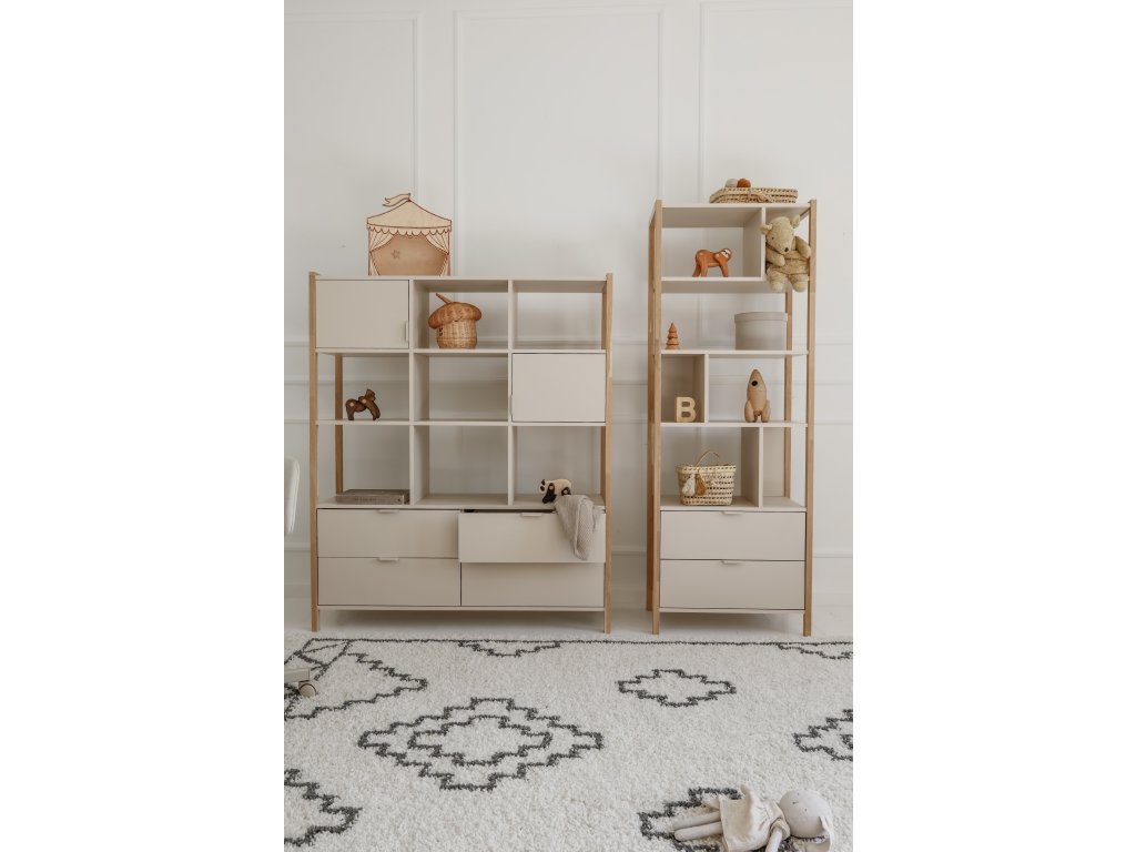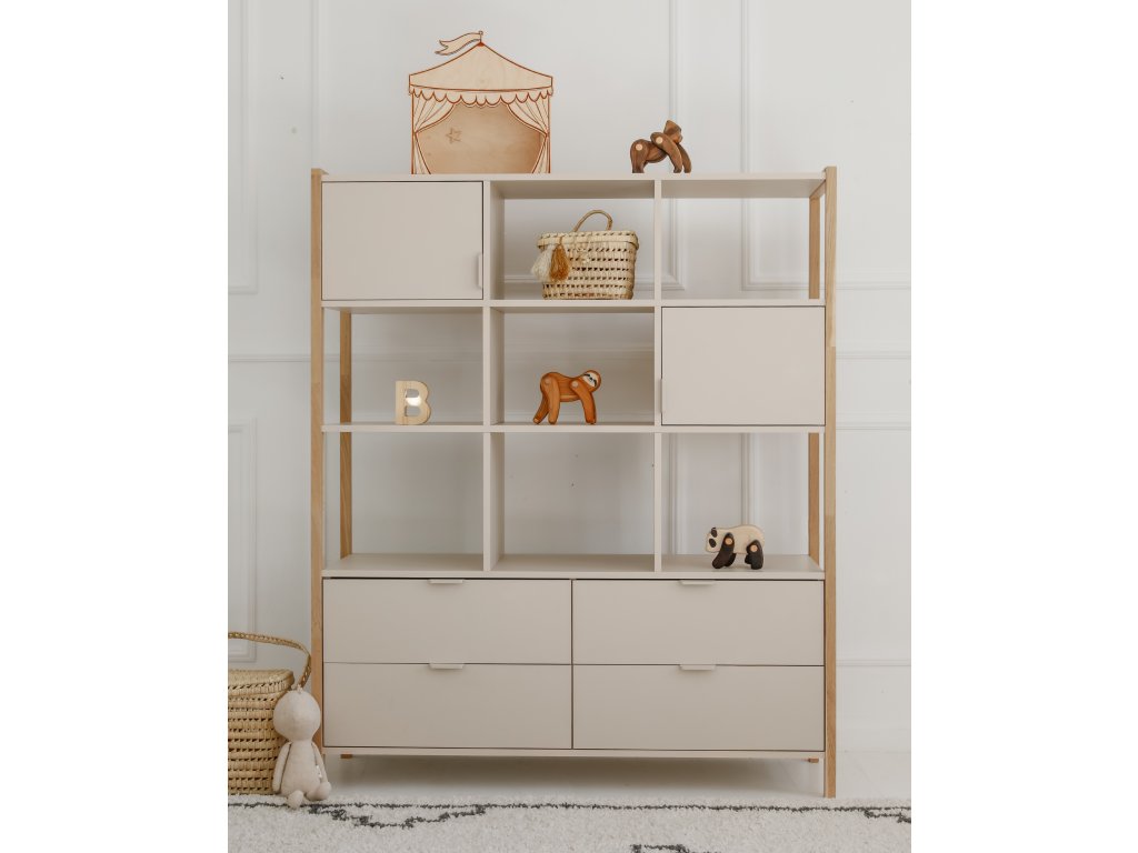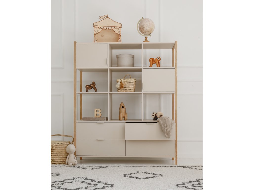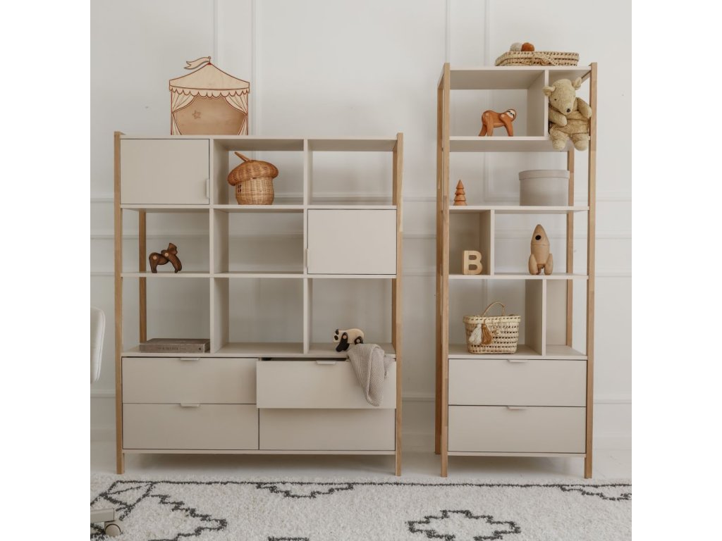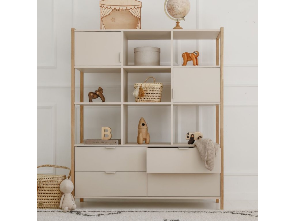 Praktický široký regál Versa o výšce 150 cm nabízí čtyři zásuvky, dvě uzavřené skříňky a otevřené police. Díky kombinaci barvy latte a přírodního dubu zapadne do dětských i rodinných interiérů. Pro bezpečnost je možné jej připevnit na zeď.