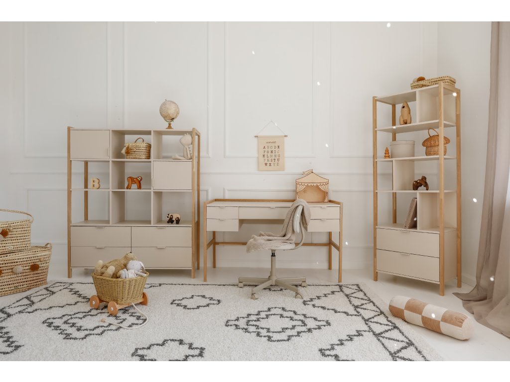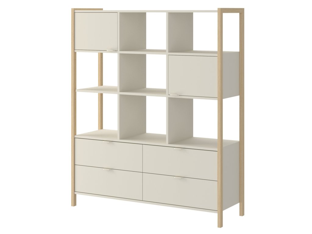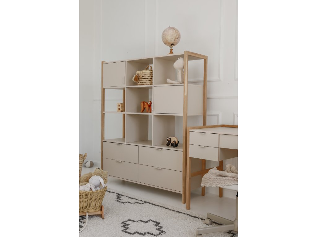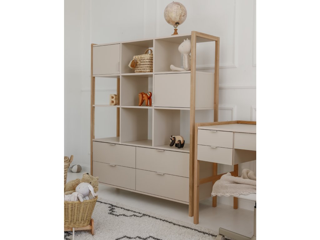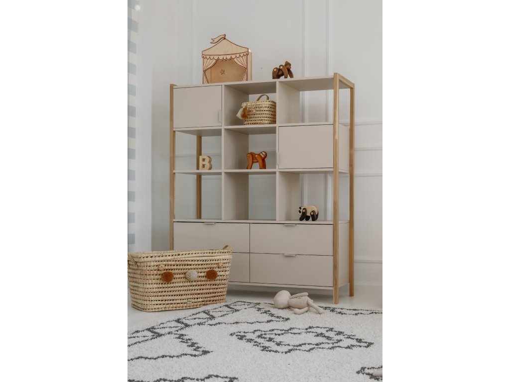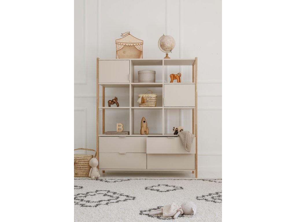 Praktický široký regál Versa o výšce 150 cm nabízí čtyři zásuvky, dvě uzavřené skříňky a otevřené police. Díky kombinaci barvy latte a přírodního dubu zapadne do dětských i rodinných interiérů. Pro bezpečnost je možné jej připevnit na zeď.