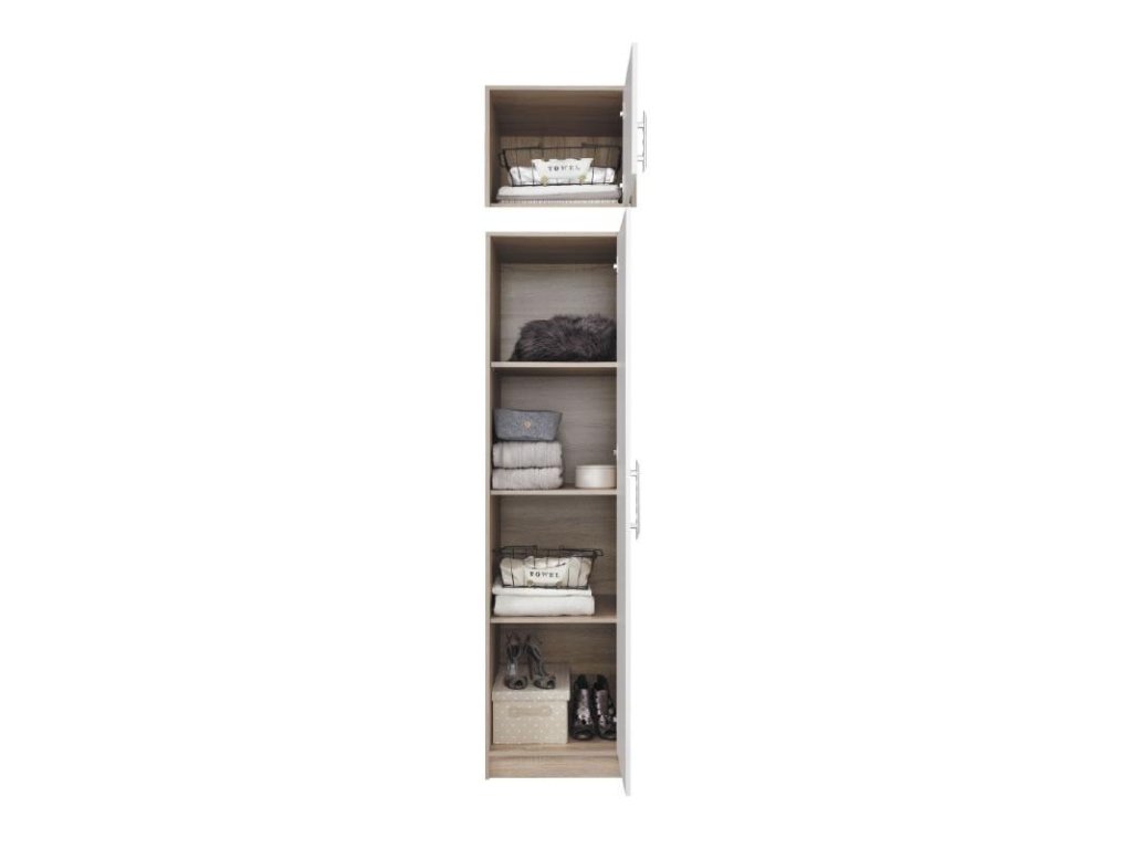 Skříň Smart SR5 zaujme po vizuální stránce, ale o nic horšího není na tom ani co se týče úložné plochy. Skříň nabídne 4 poličky do kterých lze uložit nejen oblečení, ale v případě potřeby i knihy, boxy, pořadače, sportovní pomůcky, sezónní doplňky a jiné užitečné drobnosti. V případě, že chcete zvýšit kapacitu úložného prostoru skříně, doporučujeme vám dokoupit si nástavec na skříň SRN5.