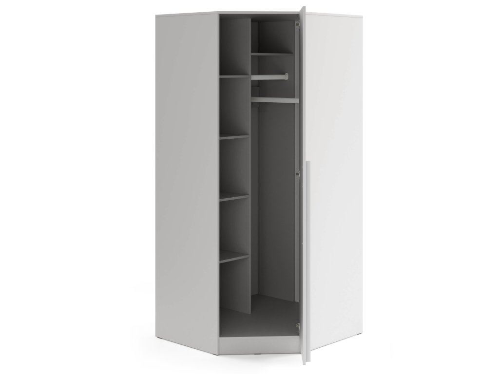 Rohová šatníková skriňa Braga BR4 v modernom sivom prevedení ponúka praktický úložný priestor a zároveň pomáha využiť roh miestnosti. Vnútorné vybavenie tvorí policová časť a priestor so šatníkovými tyčami, ktorý umožňuje prehľadné uloženie oblečenia. Jednoduchý dizajn skrine sa hodí do moderných aj nadčasových interiérov.