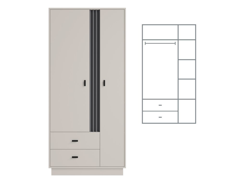 Moderní šatní skříň Allmo 02 vyplní prázdný prostor ve vaší ložnici. Kromě toho poskytne prostor pro uložení oblečení. Skříň je vyrobena v barevné kombinaci béžová (kašmír) a antracit. Stojí na podstavci, který mu přidává na stabilitě.