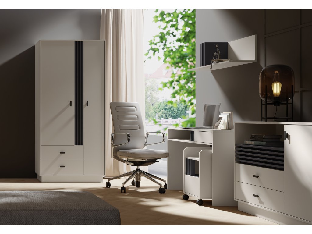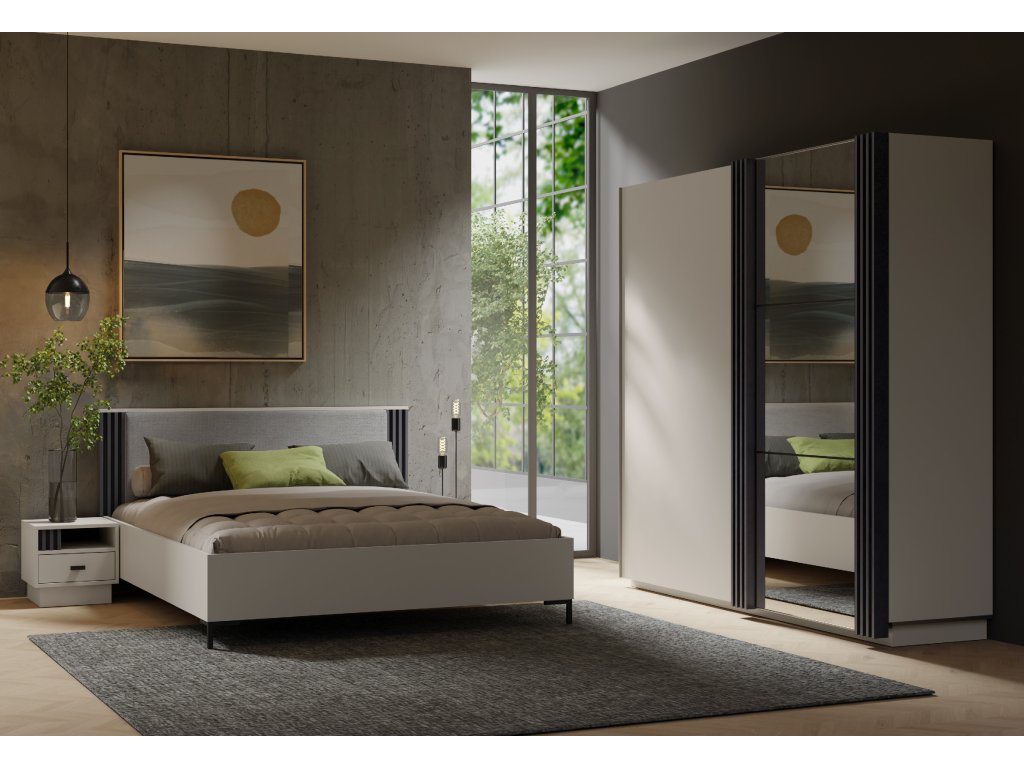 Kolekce Allmo přináší do ložnice moderní design, který spojuje eleganci a praktičnost. Hlavním prvkem je nadčasová kašmírově béžová barva doplněná o antracitové lamelové detaily, které dodávají nábytku jedinečný charakter. Černé úchyty podtrhují minimalistický styl a vytvářejí atraktivní kontrast. Celý nábytek je postaven na stabilním soklu ve stejné barevnosti, což působí harmonicky a elegantně.