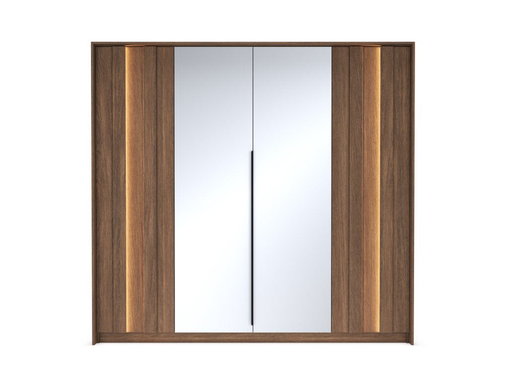 Skriňa je vybavená štyrmi dverami, pričom stredné dvere sú so zrkadlom. Vnútorný priestor ponúka dve tyče na zavesenie odevov a police v bočných častiach pre prehľadné uskladnenie. Vyhotovená je v dekore dub tmavý (dunin) s dôrazom na moderný dizajn s MDF lištami a LED osvetlením na frontoch.