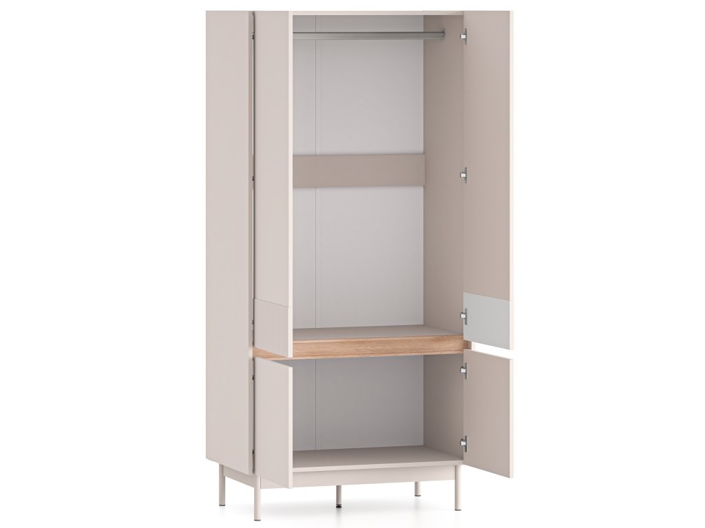 Šatní skříň Dunea 01 v kašmírově béžové a dekoru dub krémový je praktickým řešením pro každodenní uložení oděvů a textilií. Nabízí široký prostor pro zavěšení oblečení a spodní otevřenou přihrádku na drobnosti či lůžkoviny. Kovové nožičky jí dodávají styl i stabilitu. Díky tichému dovírání dvířek je používání skříně pohodlné. Skvěle zapadne do moderní ložnice, šatníku nebo chodby.