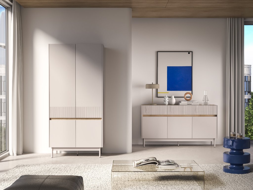 Minimalistické bezúchytkové MDF čela, jemně frézované rýhované detaily, kovové nožky a praktické funkce jako tiché dovírání a možnost osvětlení dělají z nábytku Dunea ideální volbu pro každého, kdo hledá krásu i praktičnost v jednom. Kolekce je navržena tak, aby se snadno přizpůsobila různým prostorům – bez ohledu na jejich velikost.
