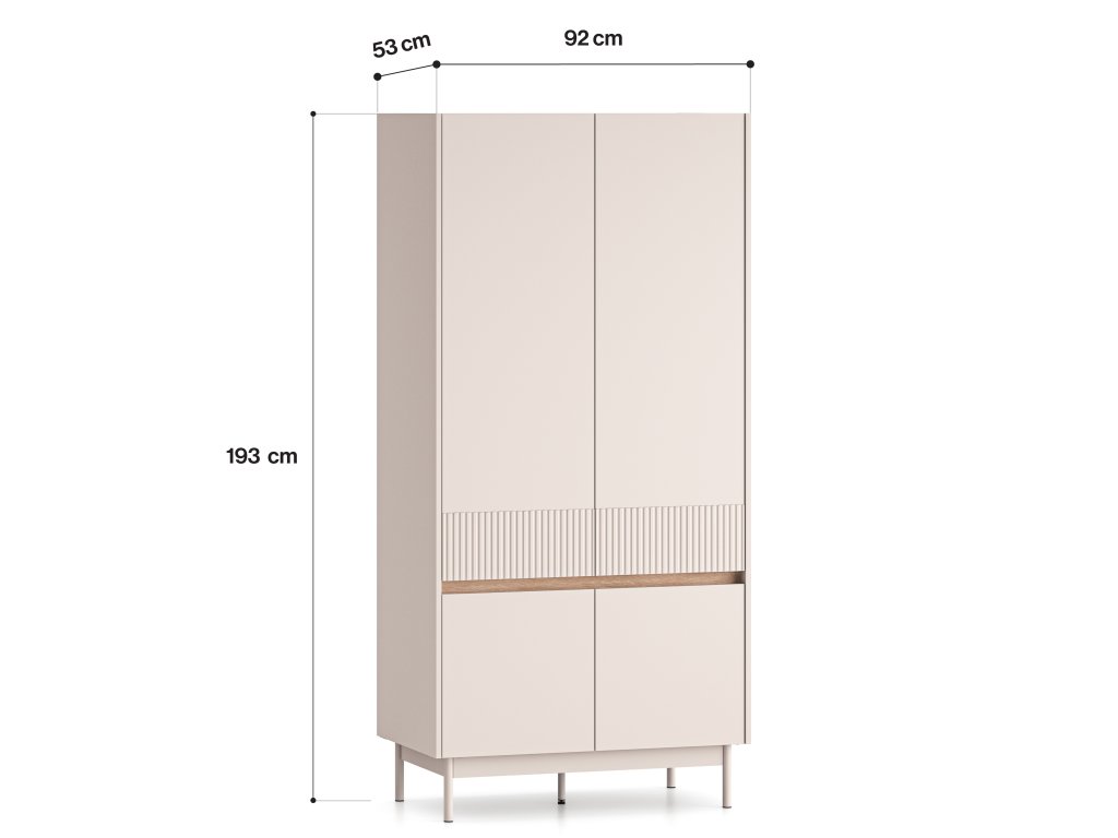 Skříň má praktické rozměry – výška 193 cm, šířka 92 cm a hloubka 53 cm, takže se vejde i do menších prostor bez ztráty úložné kapacity. Stojí na kovových nožičkách, které jí dodávají vzdušnost a zároveň umožňují snadný úklid pod ní. Barevná kombinace kašmírově béžová a dub krémový působí jemně a moderně.