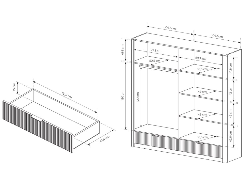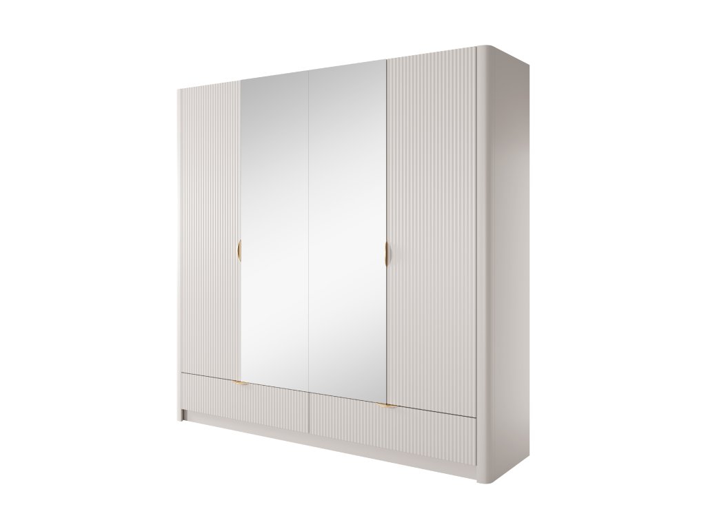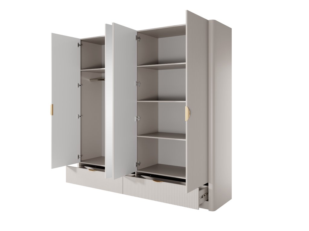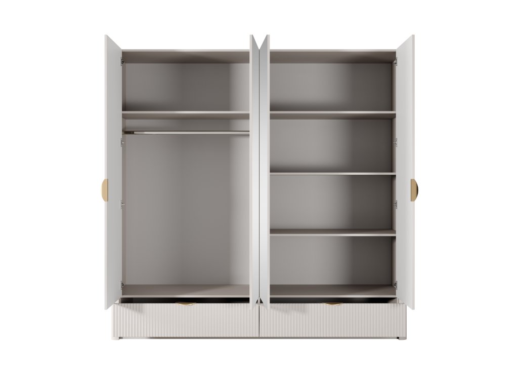 Béžová skříň se 4 dvířky s klasickým otevíráním vám poskytne dostatek úložného místa. Skříň je rozdělena na pravou a levou stranu. V části skříně se nacházejí 3 prostorné police. Na levé straně je 1 police a 1 věšáková tyč pro zavěšení oblečení. Aby toho nebylo málo ve spodní části se nacházejí 2 zásuvky. Skříň se vyznačuje i absencí ostrých hran, což dodává nábytku eleganci a bezpečnost.
